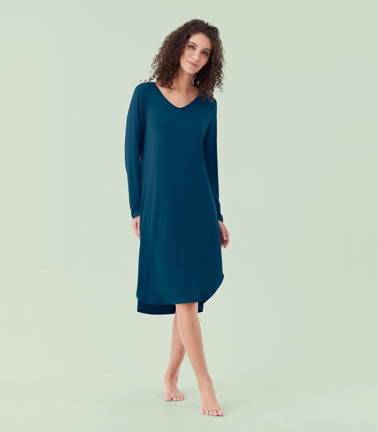 WiWi Nightgowns for Women Soft Sleepwear Long Sleeve Nightshirts Pajamas Gown Viscose from Bamboo Sleepwear S-XXL(A-peacock Blue)