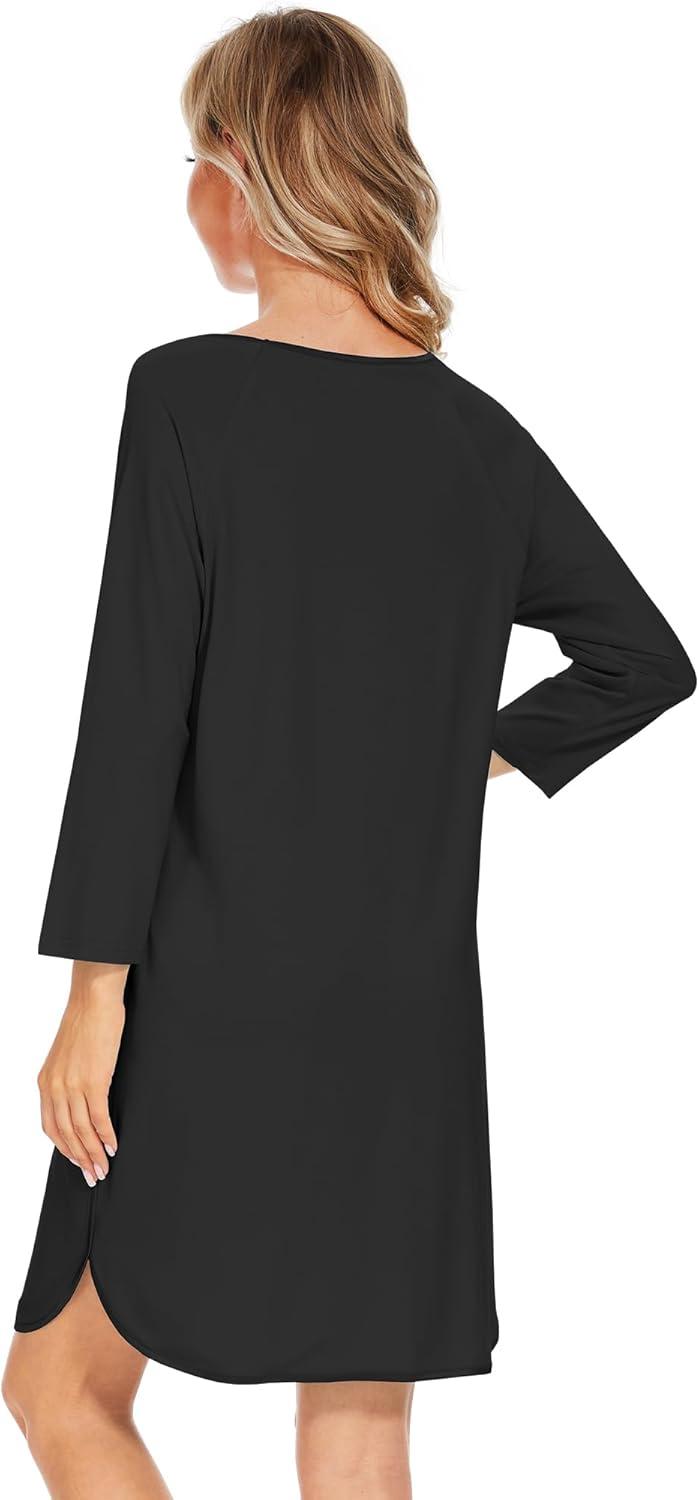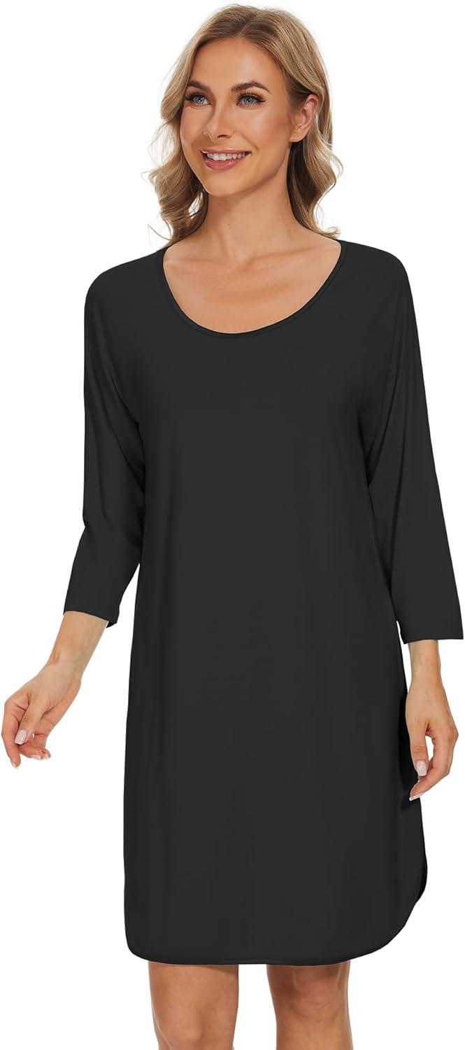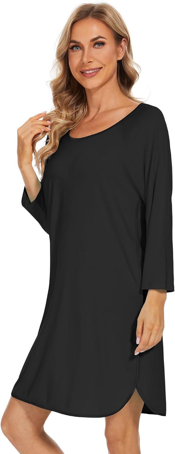 WiWi Bamboo Viscose Nightgowns for Women 3/4 Sleeve Nightshirts Sleep Shirt Plus Size Sleepwear Pajamas Dress S-4X(E-black)