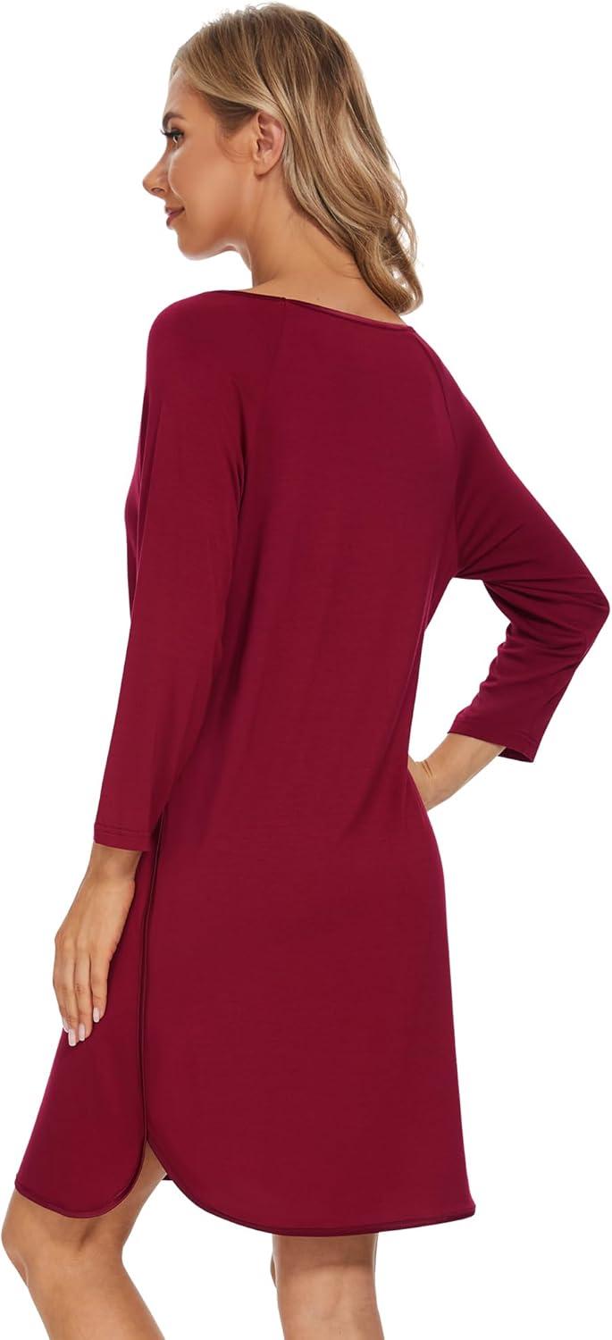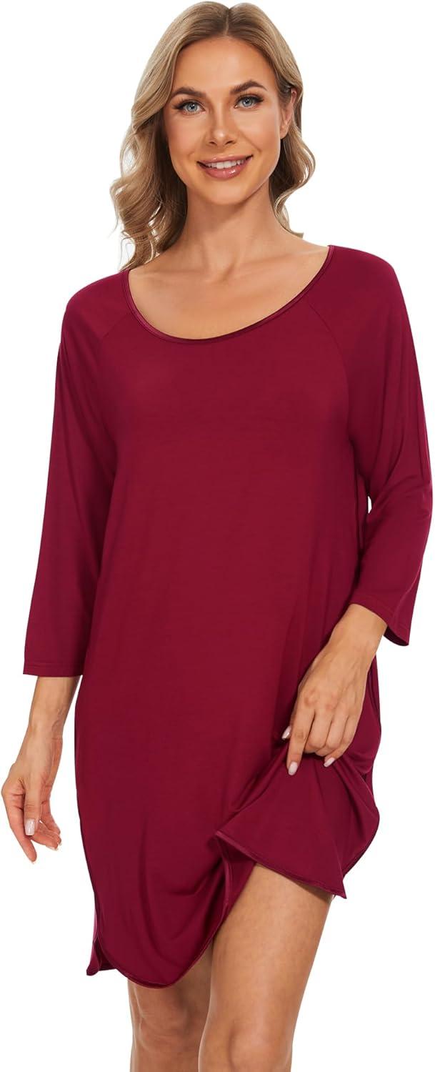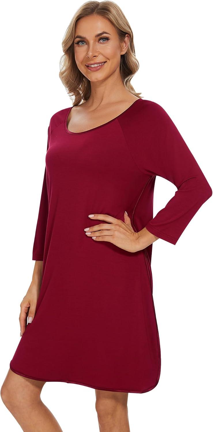 WiWi Bamboo Viscose Nightgowns for Women 3/4 Sleeve Nightshirts Sleep Shirt Plus Size Sleepwear Pajamas Dress S-4X(E-wine)