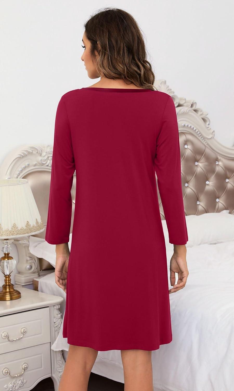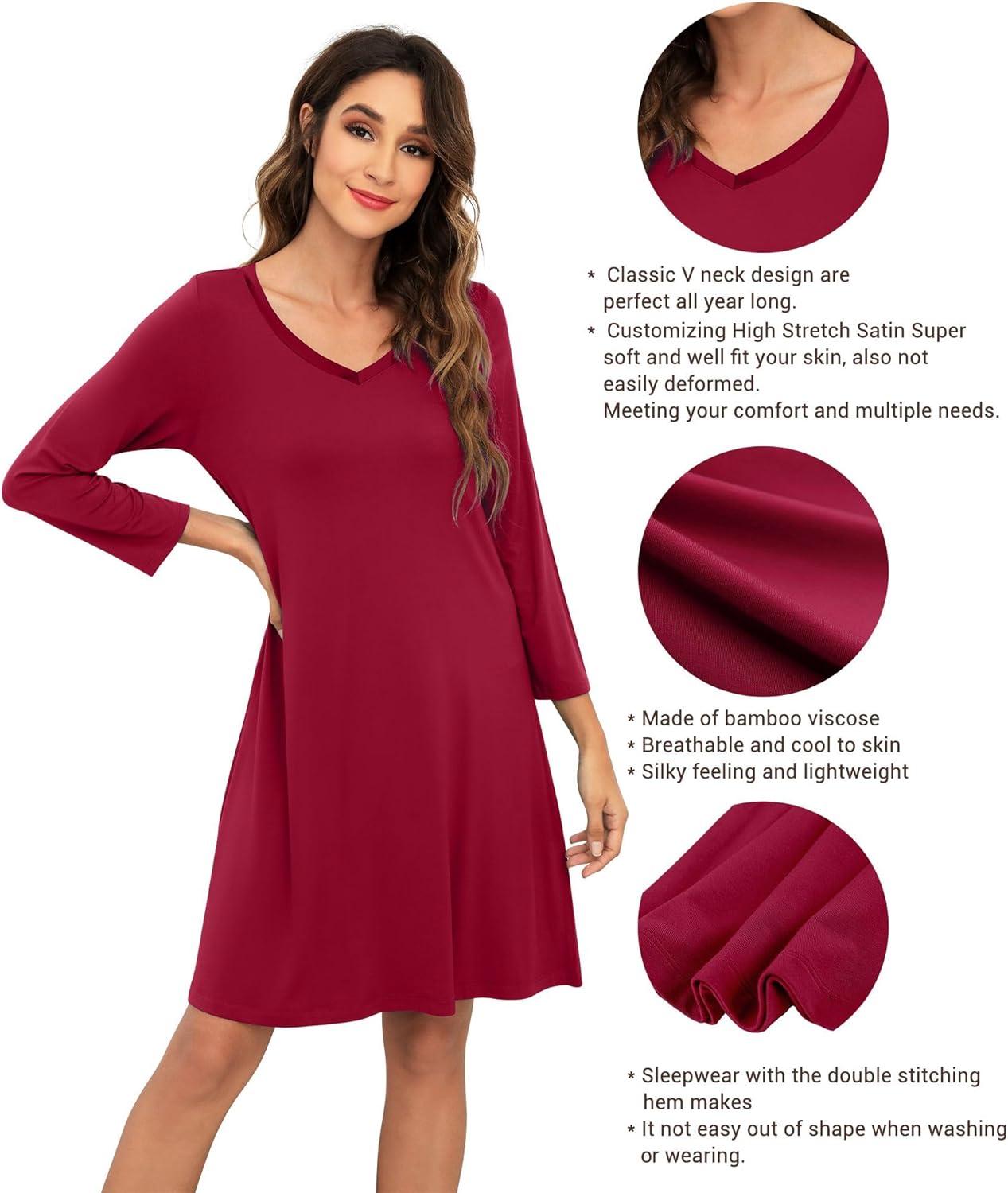 WiWi Bamboo Viscose Nightgowns for Women Soft Long Sleeve Nightgown Plus Size Sleep Shirt Pajama Gown Sleepwear S-4X(A-wine Red)