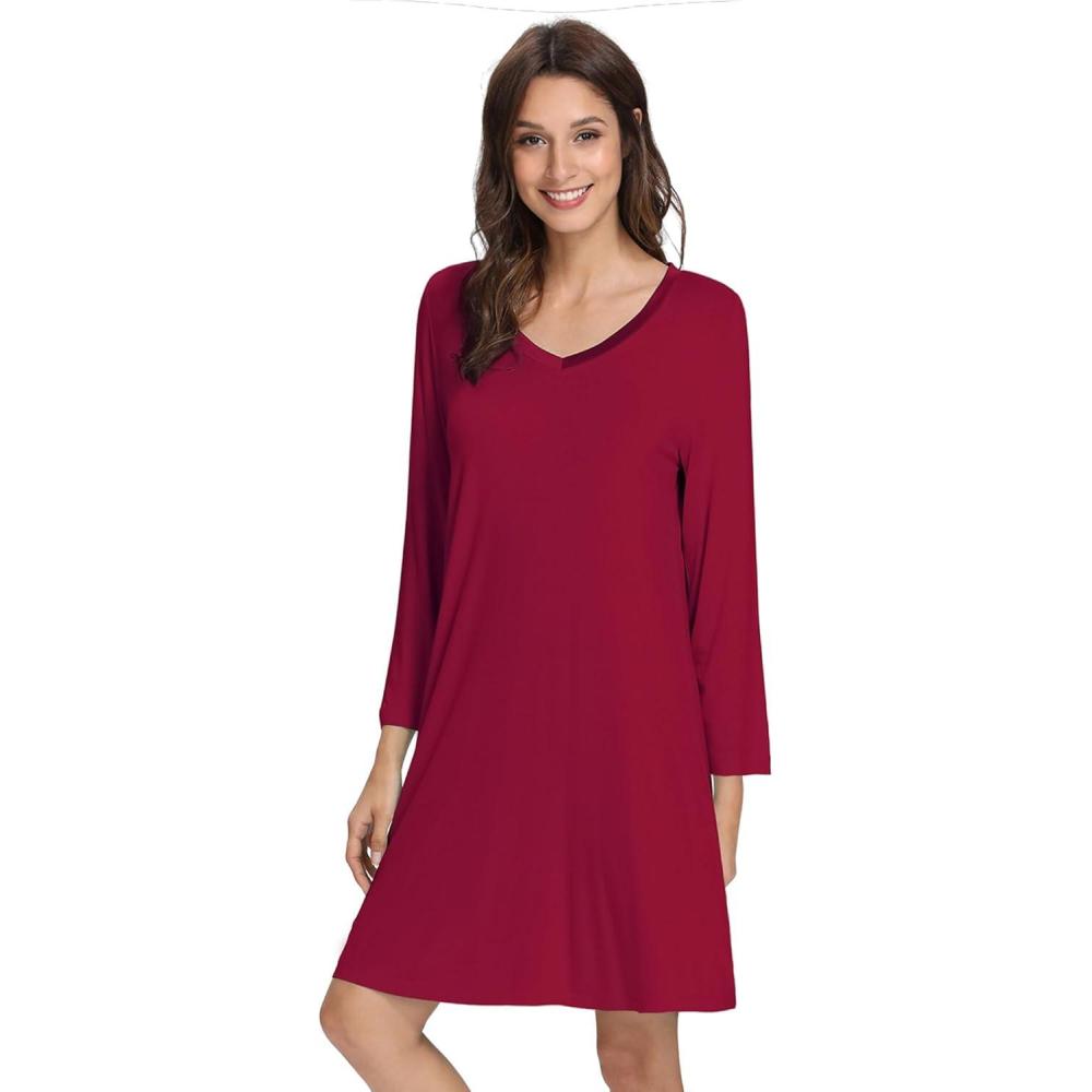 imageWiWi Bamboo Viscose Nightgowns for Women Soft Long Sleeve Nightgown Plus Size Sleep Shirt Pajama Gown Sleepwear S4XAwine Red