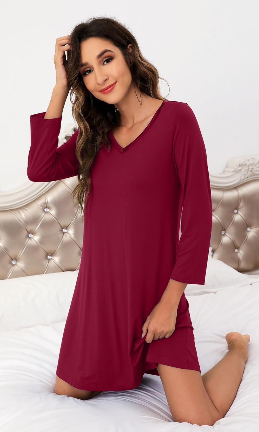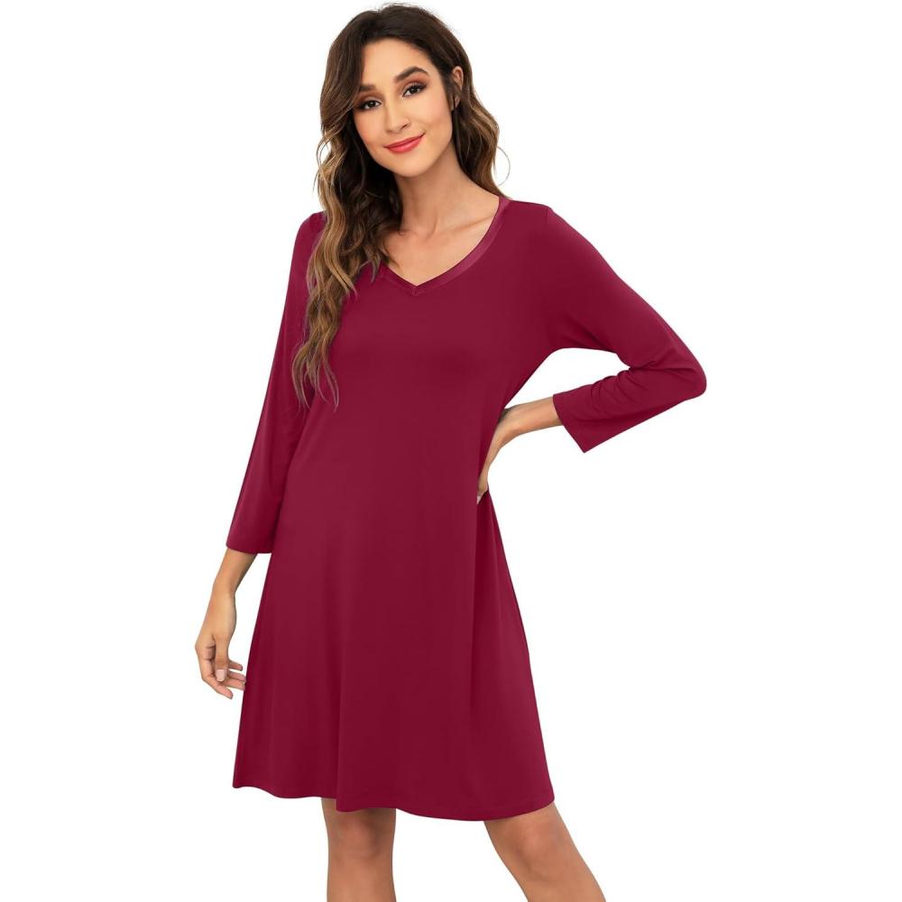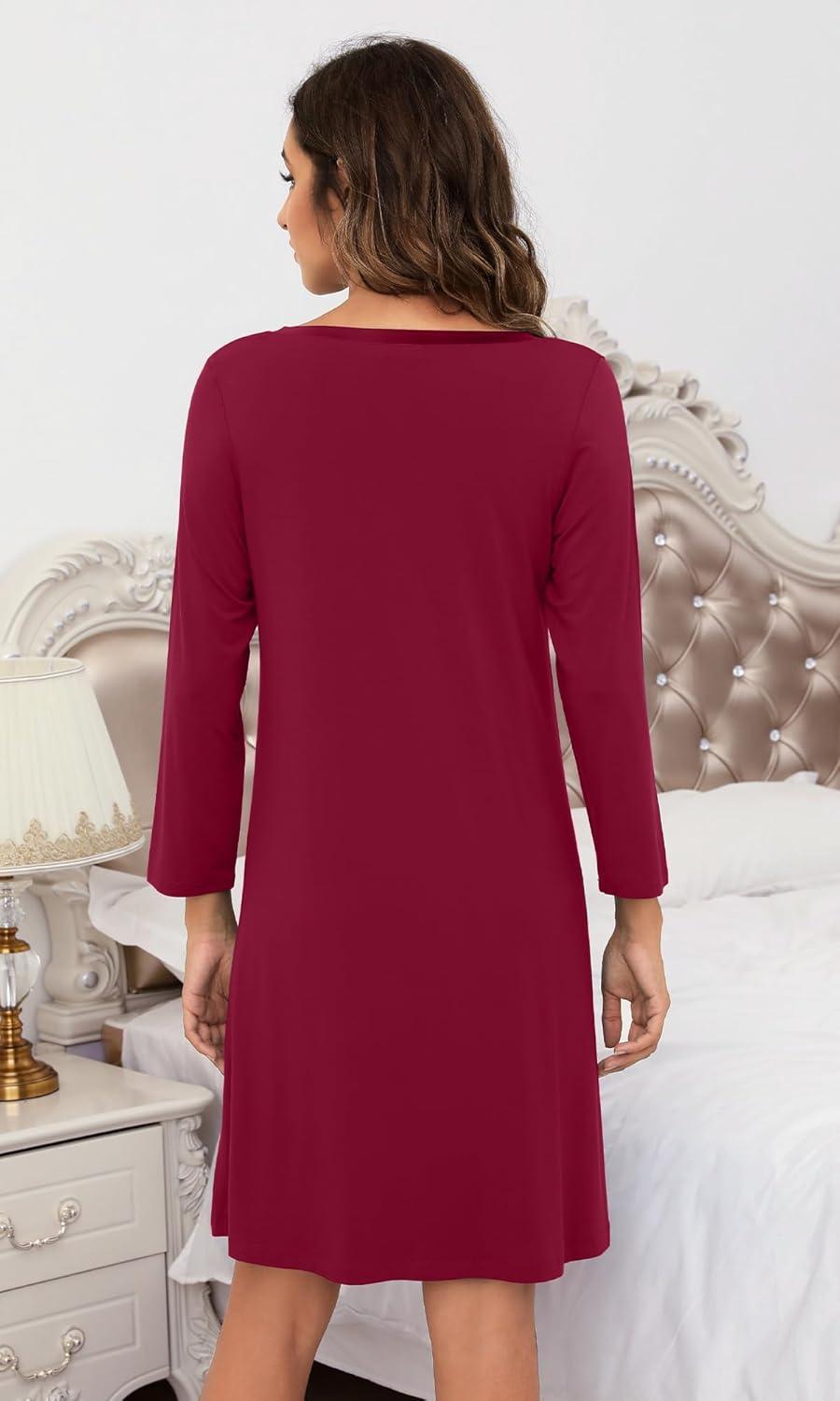 imageWiWi Bamboo Viscose Nightgowns for Women Soft Long Sleeve Nightgown Plus Size Sleep Shirt Pajama Gown Sleepwear S4XAwine Red