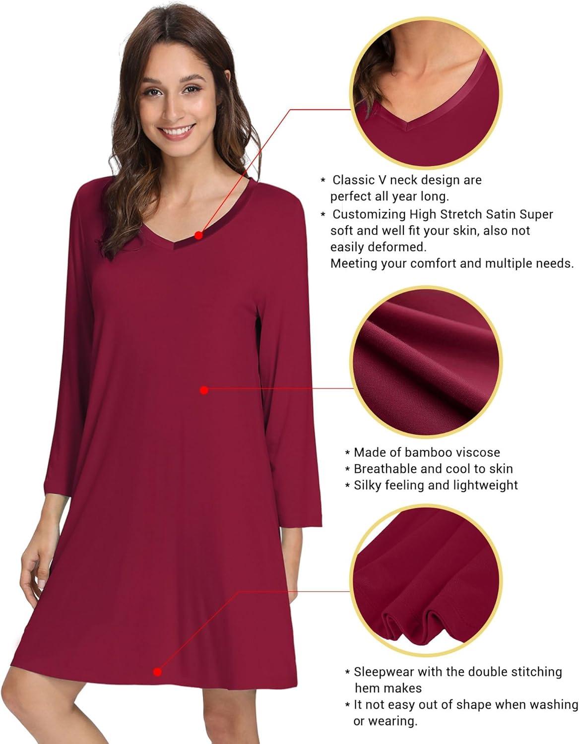 imageWiWi Bamboo Viscose Nightgowns for Women Soft Long Sleeve Nightgown Plus Size Sleep Shirt Pajama Gown Sleepwear S4XAwine
