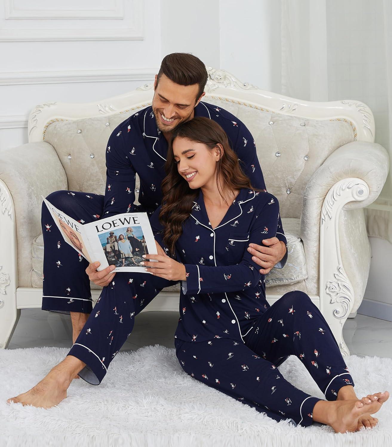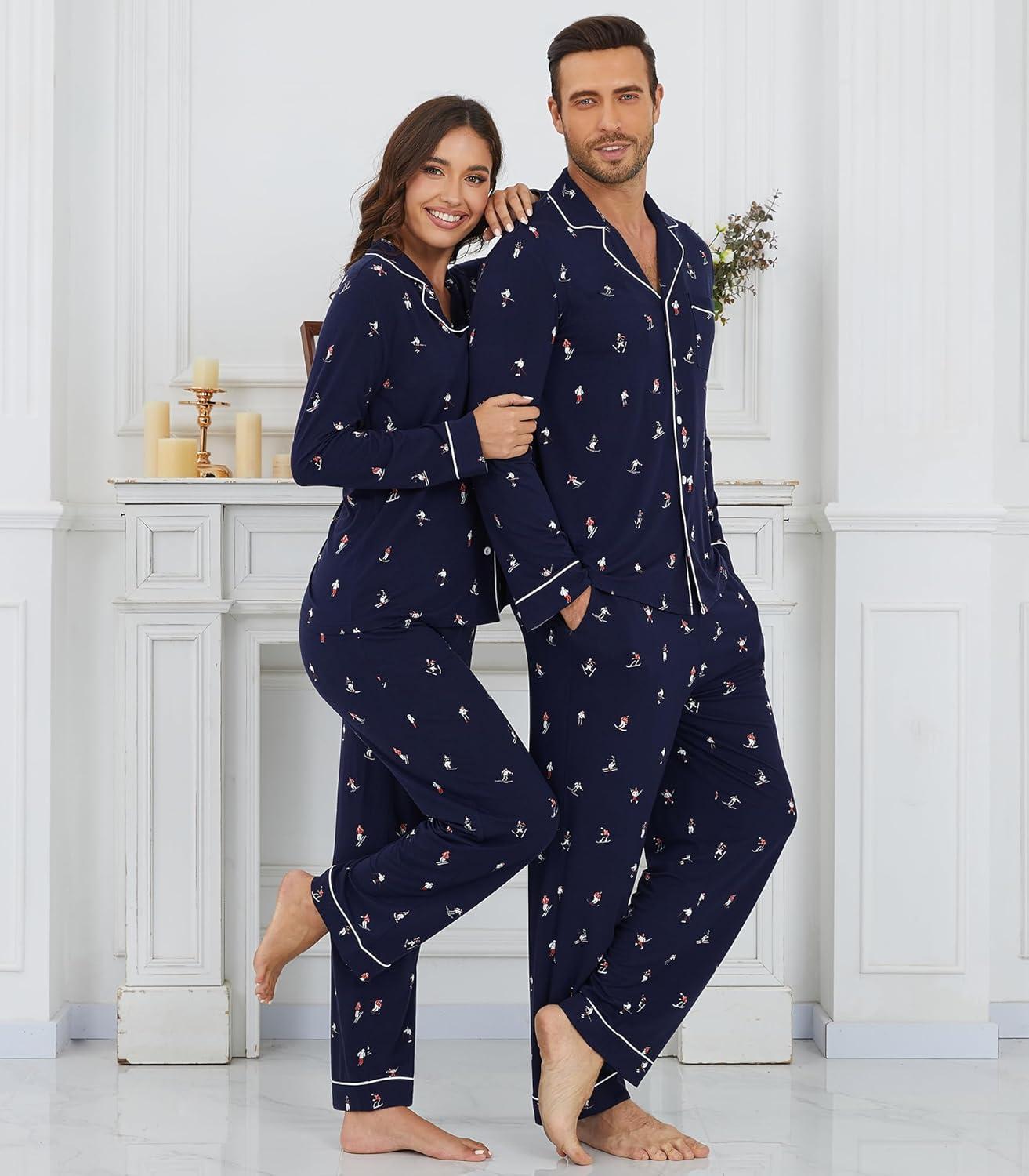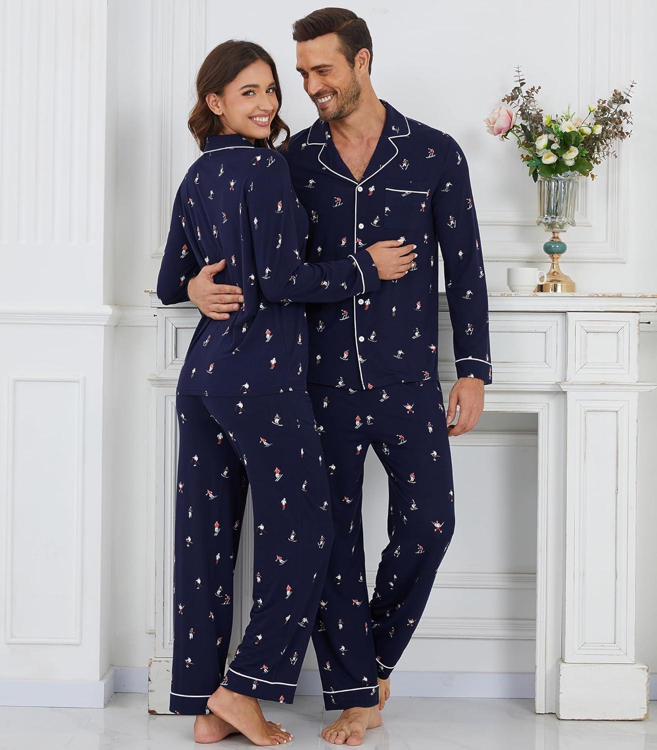 WiWi Couples Pajamas Set Women & Men Long Sleeve 2 Piece Pj Sets Viscose from Bamboo Button Down Sleepwear S-XXL(Skiing on Navy)