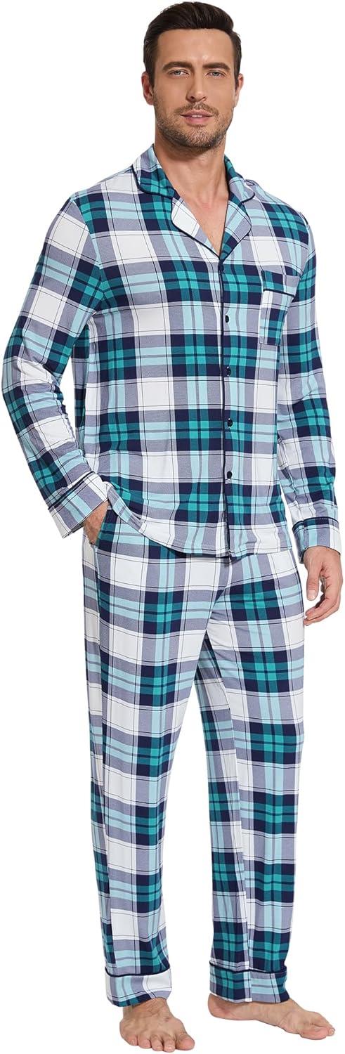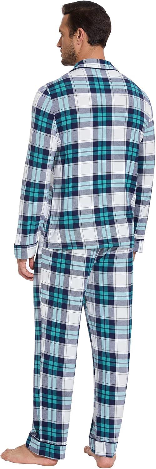 WiWi Men's Pajama Set Soft Sleepwear Button Down Pajamas Sets Classic Notch Collar Loungewear Viscose from Bamboo Pjs S-XXL(A-navy/Green Plaid)