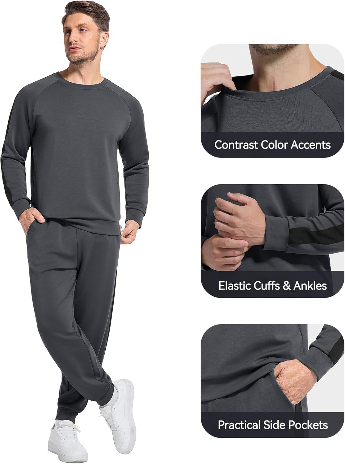 Crafted from a premium blend of 40.8% Modal, 40.8% Cotton, 13.4% Polyester, and 5% Spandex, this men’s tracksuit set offers a soft, breathable, and flexible feel for all-day comfort. Designed with a classic crew neck, raglan sleeves, and contrast color details, it delivers a clean, modern look with sporty charm. Elastic cuffs and waistband provide a secure yet relaxed fit, while side pockets add convenient storage. Perfect for lounging, workouts, travel, or casual outings, this set combines comfort, style, and versatility. Machine washable for easy care.