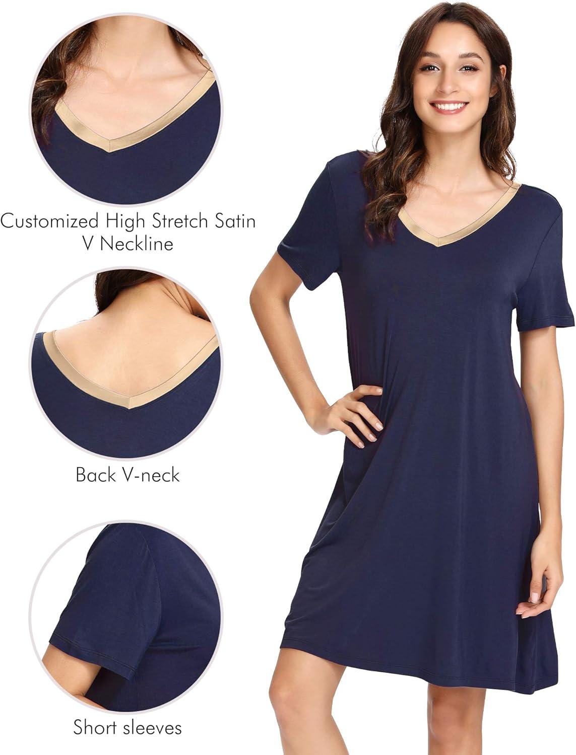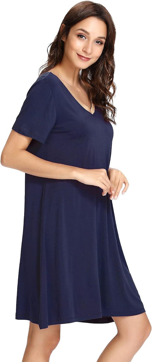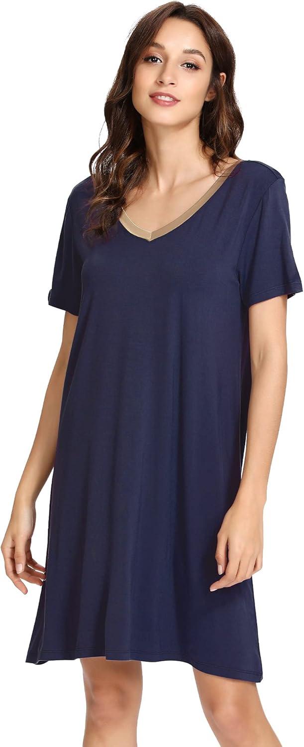 WiWi Nightgowns for Women Short Sleeve Sleepwear Soft Bamboo Viscose Pajamas Sleep Shirt Plus Size Loungewear S-4X(A-ink Blue)