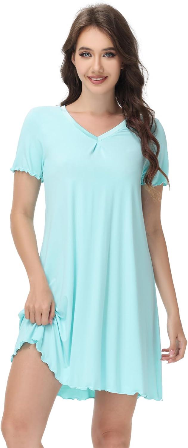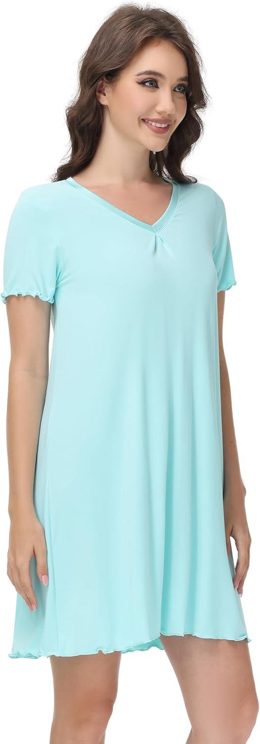 WiWi Nightgowns for Women Short Sleeve Sleepwear Soft Bamboo Viscose Pajamas Sleep Shirt Plus Size Loungewear S-4X(D-aqua)