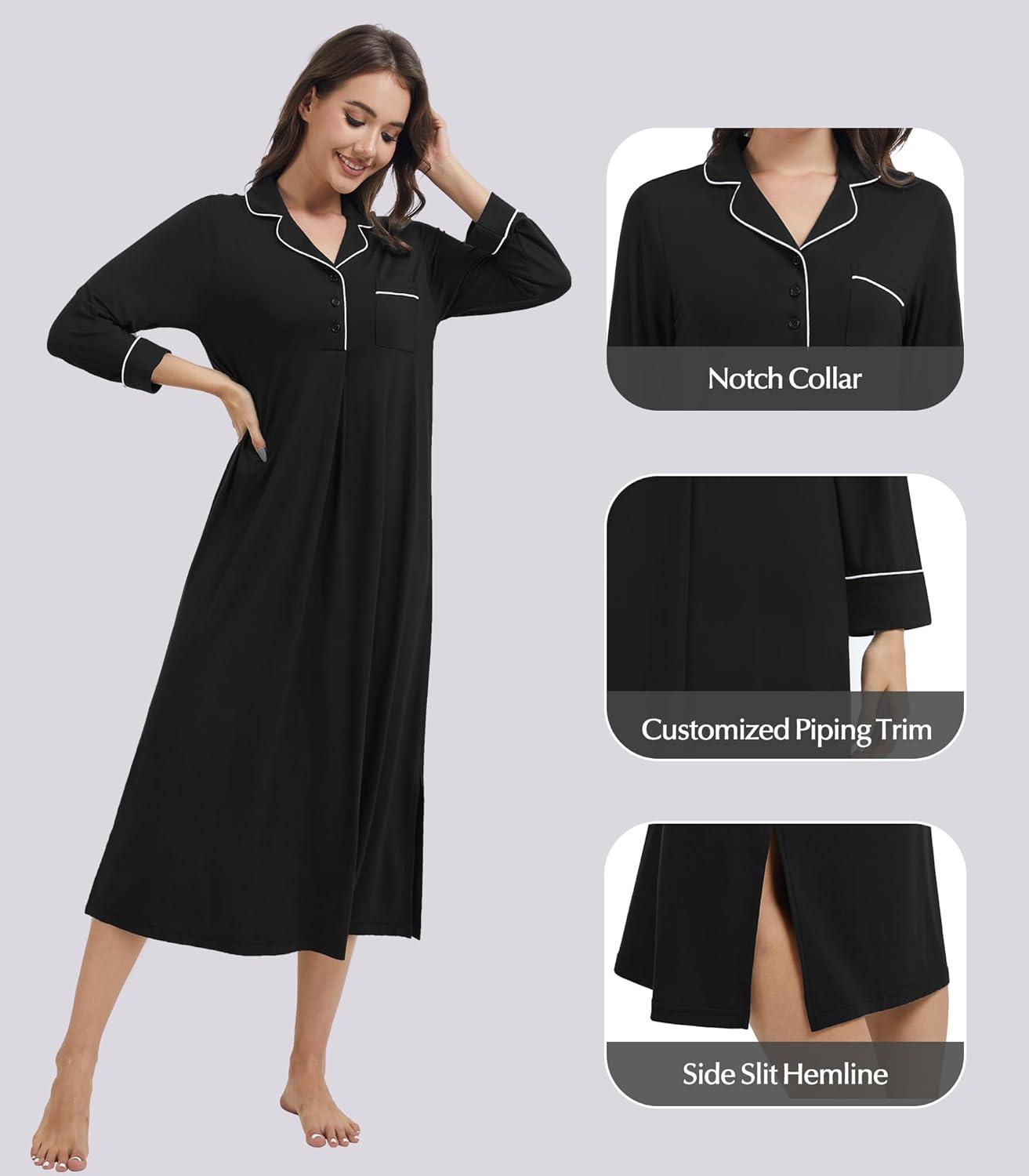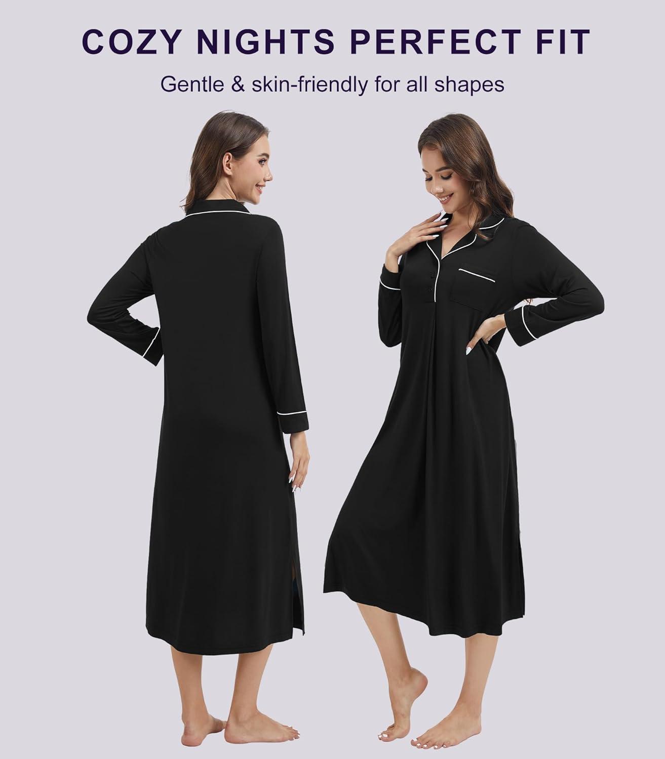 WiWi Nightgowns for Women Soft Sleepwear Long Sleeve Nightshirts Pajamas Gown Viscose from Bamboo Pjs S-XXL(B-black)
