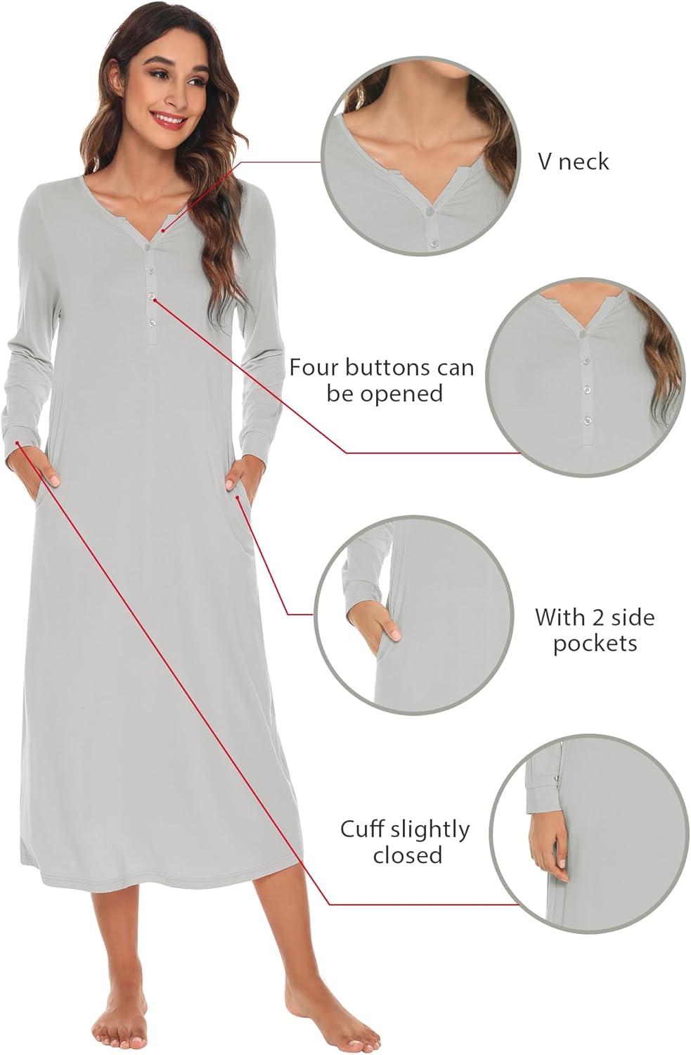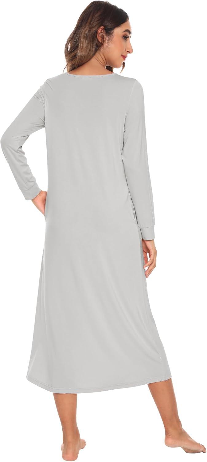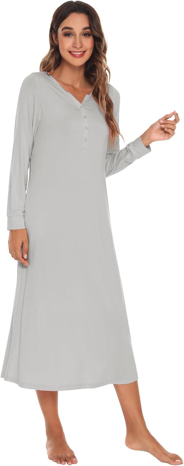 WiWi Nightgowns for Women Soft Sleepwear Long Sleeve Nightshirts Pajamas Gown Viscose from Bamboo Sleepwear S-XXL(A-light Grey)