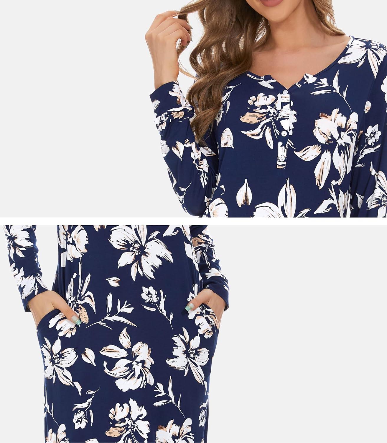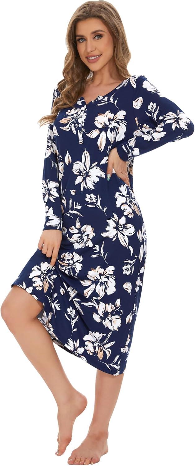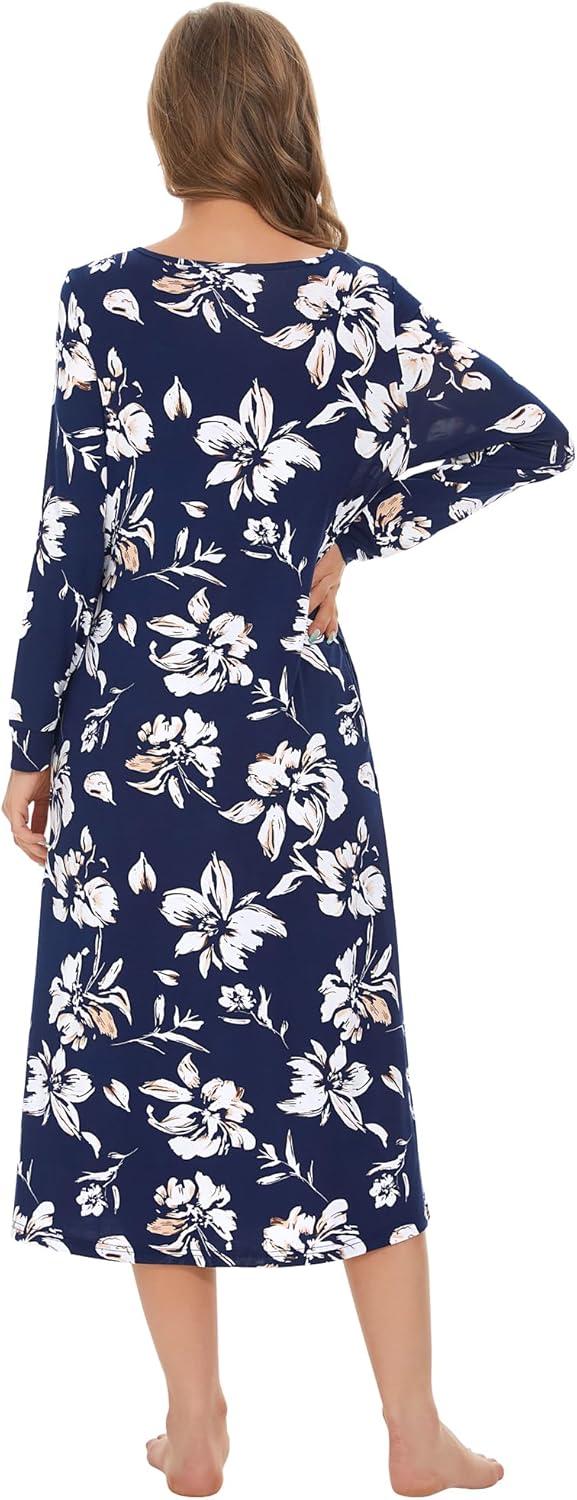 WiWi Nightgowns for Women Soft Sleepwear Long Sleeve Nightshirts Pajamas Gown Viscose from Bamboo Sleepwear S-XXL(A-navy Floral)