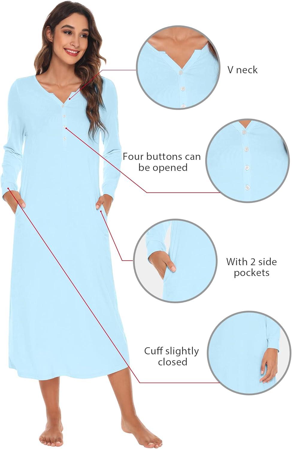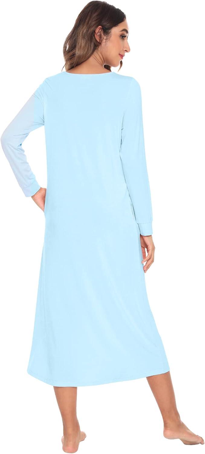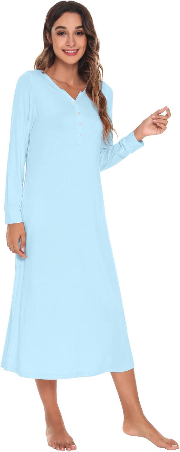 WiWi Nightgowns for Women Soft Sleepwear Long Sleeve Nightshirts Pajamas Gown Viscose from Bamboo Sleepwear S-XXL(A-pale Blue)