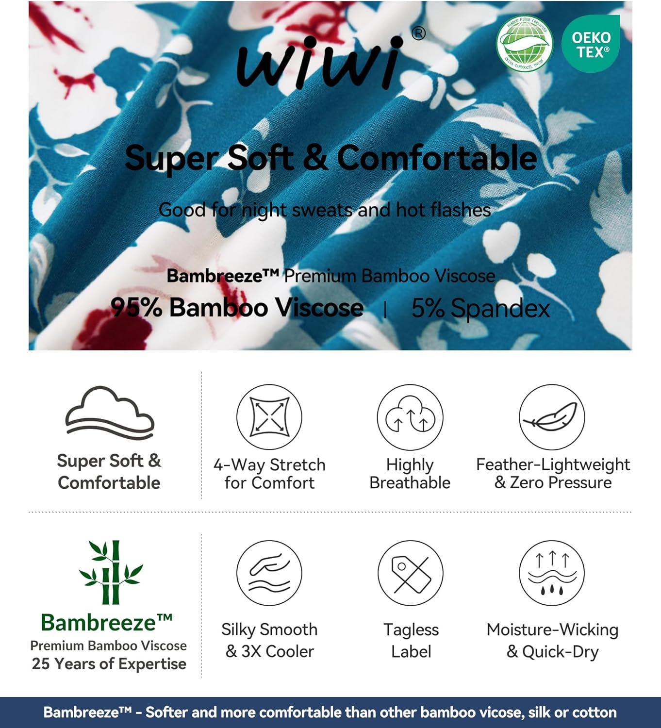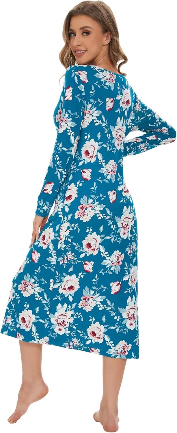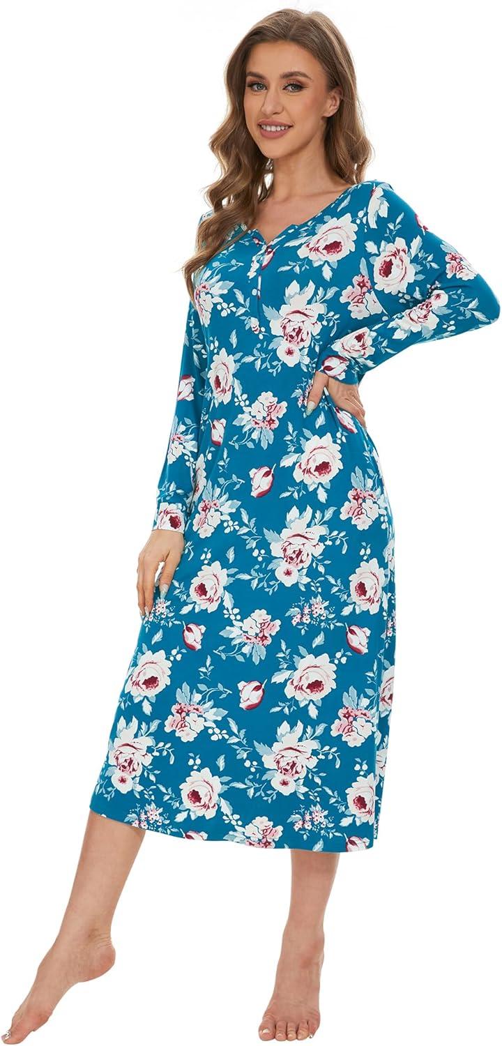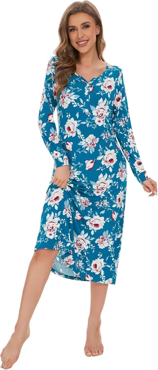WiWi Nightgowns for Women Soft Sleepwear Long Sleeve Nightshirts Pajamas Gown Viscose from Bamboo Sleepwear S-XXL(A-teal Blue/Peony)