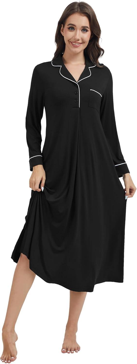 WiWi Nightgowns for Women Soft Sleepwear Long Sleeve Nightshirts Pajamas Gown Viscose from Bamboo Sleepwear S-XXL(B-black)