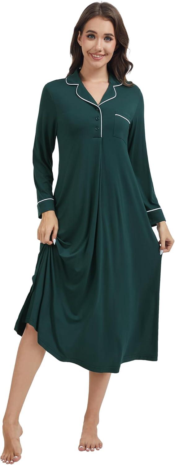 WiWi Nightgowns for Women Soft Sleepwear Long Sleeve Nightshirts Pajamas Gown Viscose from Bamboo Sleepwear S-XXL(B-blackish Green)
