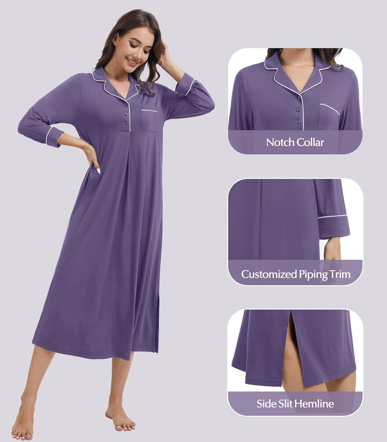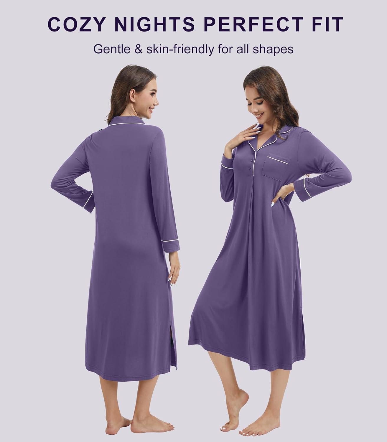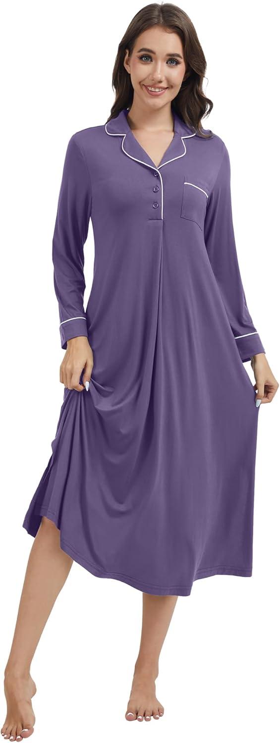WiWi Nightgowns for Women Soft Sleepwear Long Sleeve Nightshirts Pajamas Gown Viscose from Bamboo Sleepwear S-XXL(B-lavender)