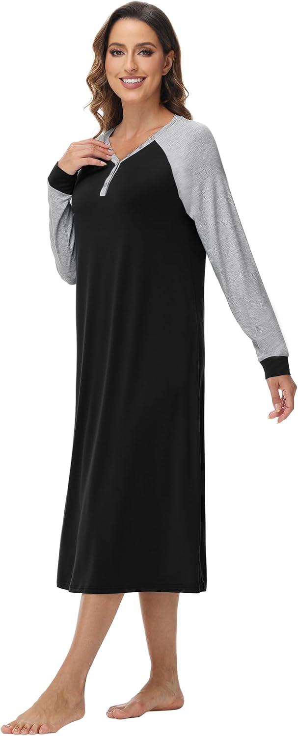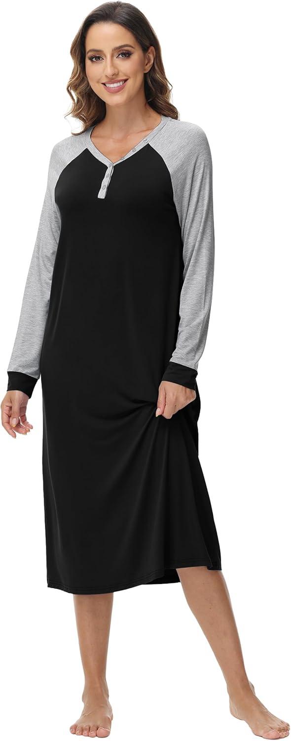 WiWi Nightgowns for Women Soft Sleepwear Long Sleeve Nightshirts Pajamas Gown Viscose from Bamboo Sleepwear S-XXL(C-charcoal Heather)