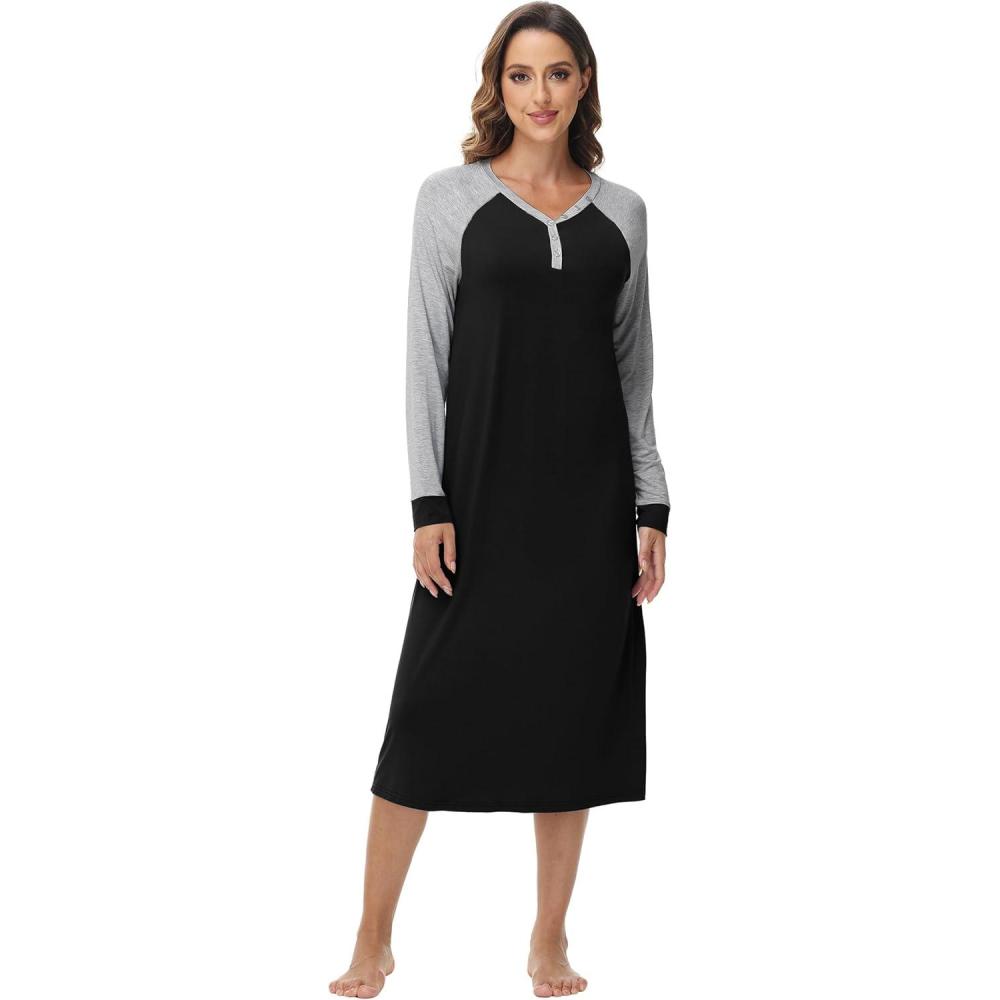 WiWi Nightgowns for Women Soft Sleepwear Long Sleeve Nightshirts Pajamas Gown Viscose from Bamboo Sleepwear S-XXL(C-ash Grey/Navy)