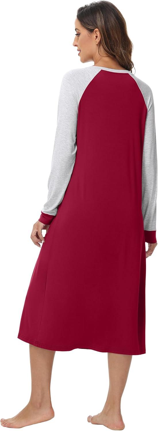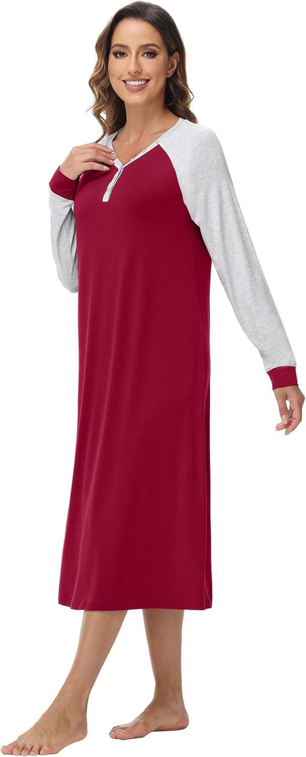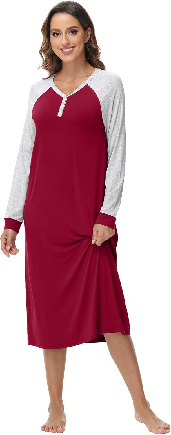WiWi Nightgowns for Women Soft Sleepwear Long Sleeve Nightshirts Pajamas Gown Viscose from Bamboo Sleepwear S-XXL(C-ash Grey/Wine Red)