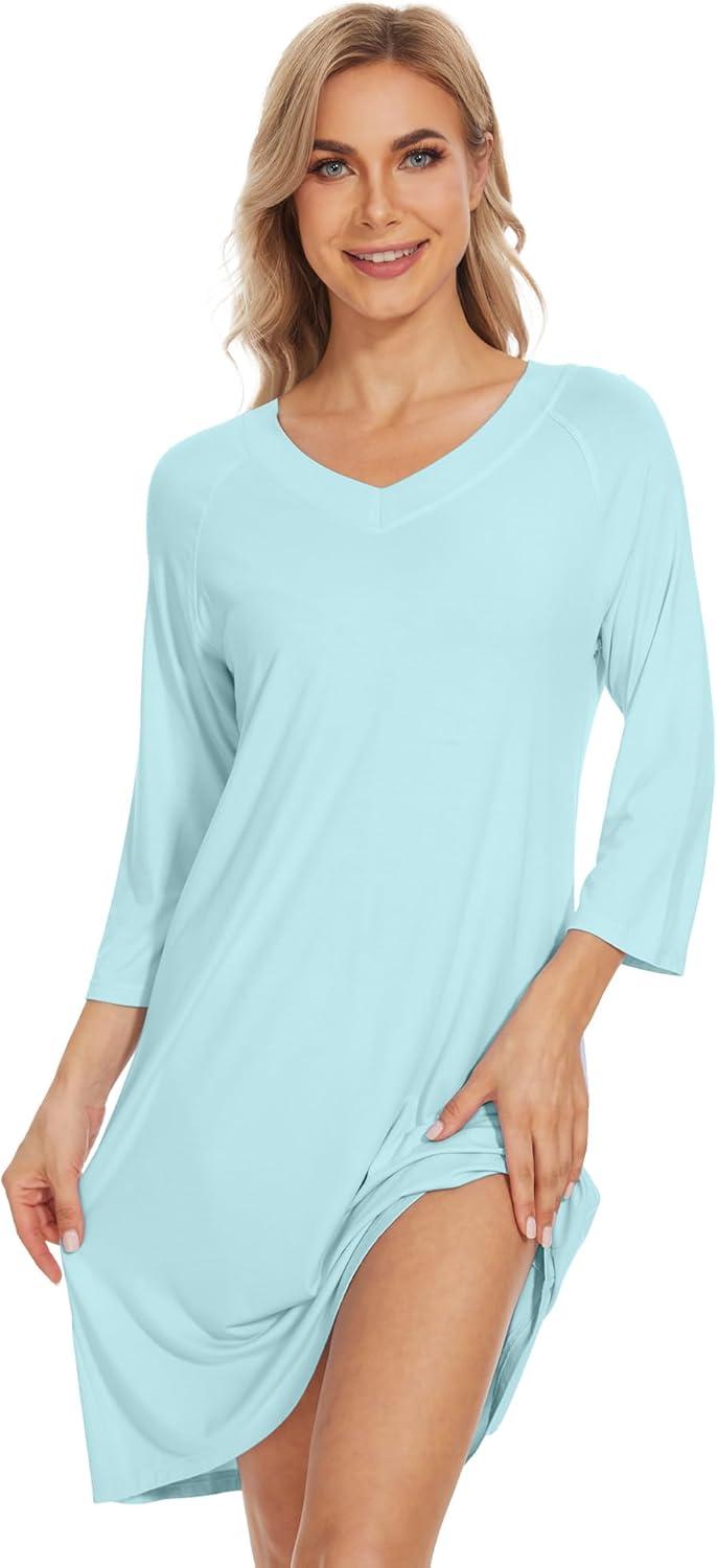 WiWi Nightgowns for Women Viscose from Bamboo 3/4 Sleeve Sleepshirt Soft V-neck Nightshirts Loose Pajama Dress S-XXL(Aqua)