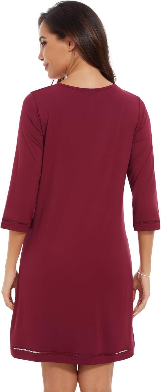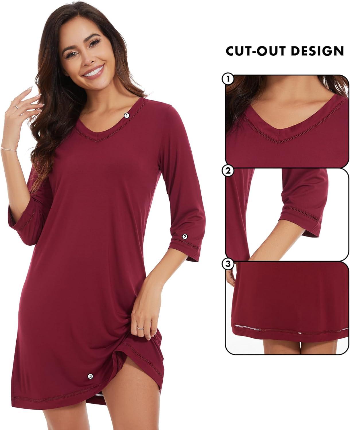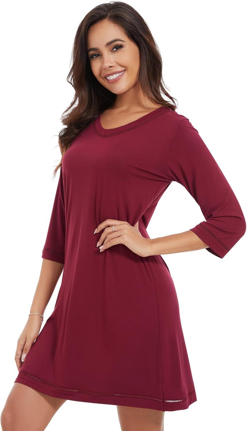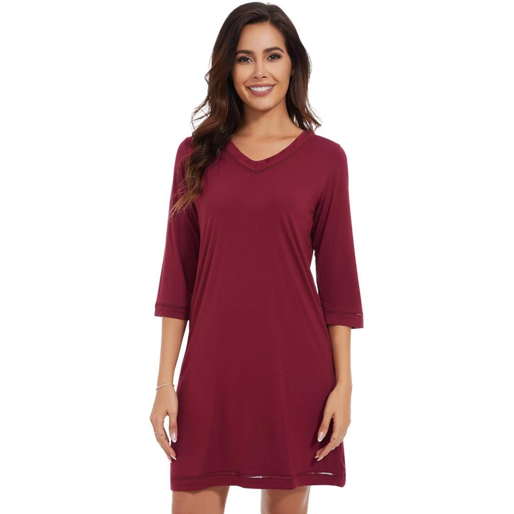 WiWi Nightgowns for Women Viscose from Bamboo Women's Nightshirts V-neck 3/4 Sleeves Night Gowns Pajamas S-XXL(Wine)