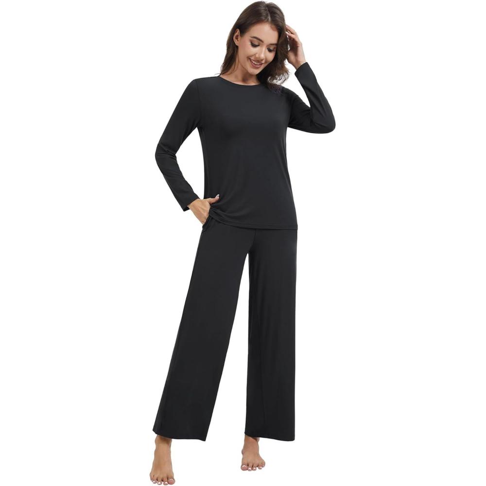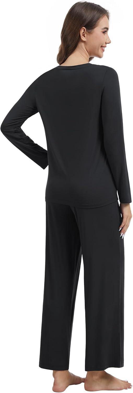 WiWi Pajama Set for Women Viscose from Bamboo Long Sleeve Top with Pants Soft Sleepwear 2 Piece Pjs Sets Loungewear S-XXL(Black)