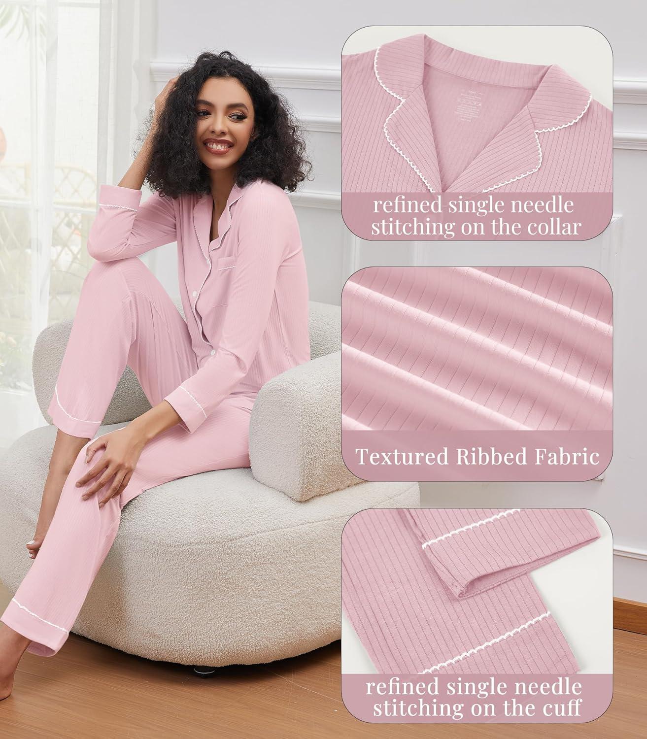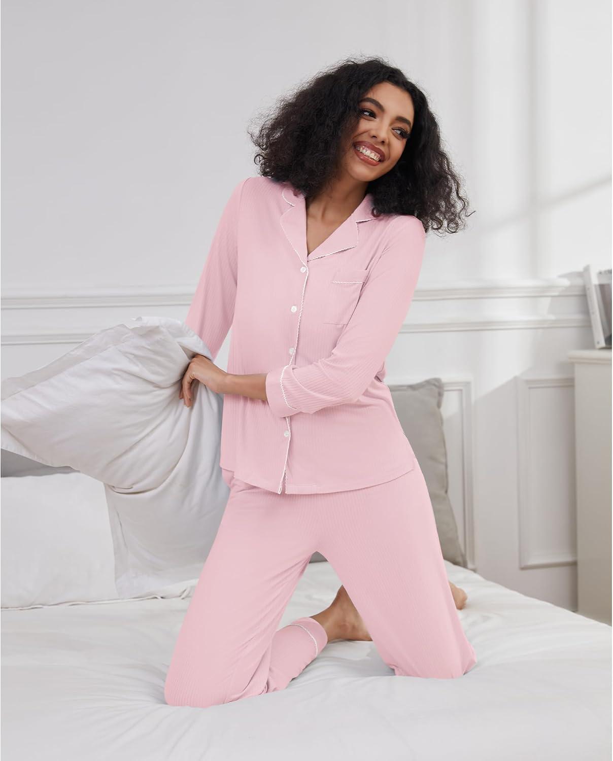 WiWi Pajamas for Women Bamboo Viscose Soft Ribbed Sleepwear Button Down Top and Pants 2 Piece Loungewear S-XXL(A-pink)