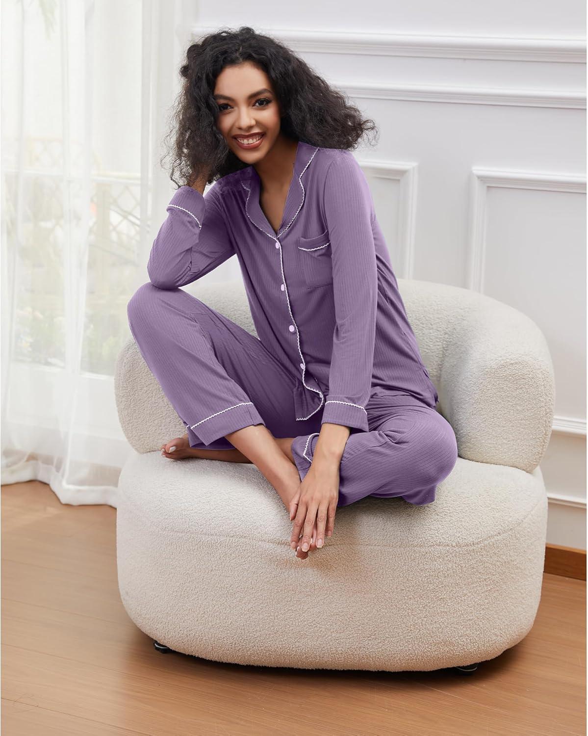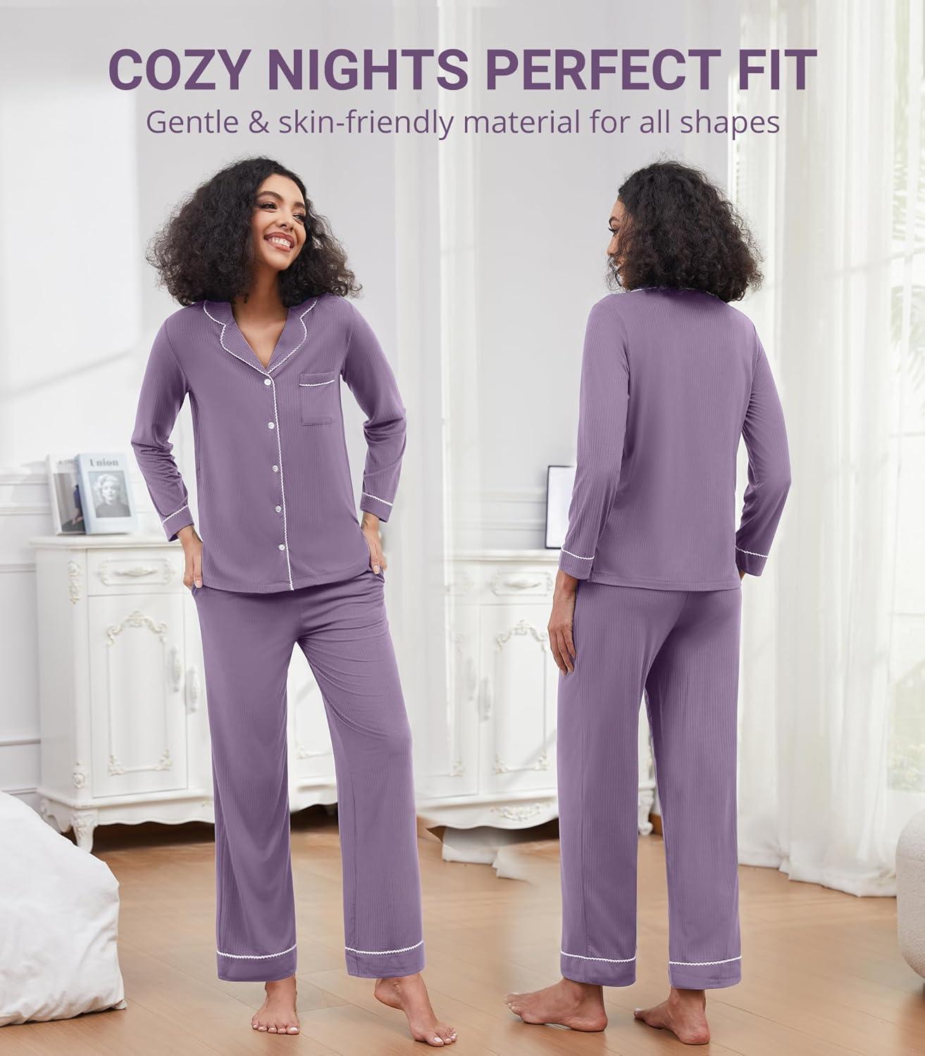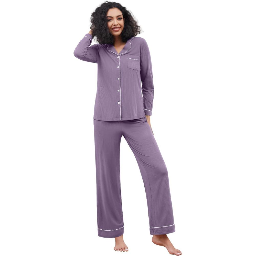 WiWi Pajamas for Women Bamboo Viscose Soft Ribbed Sleepwear Button Down Top and Pants 2 Piece Loungewear S-XXL(A-violet)