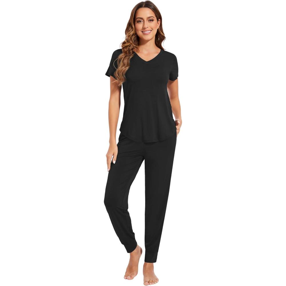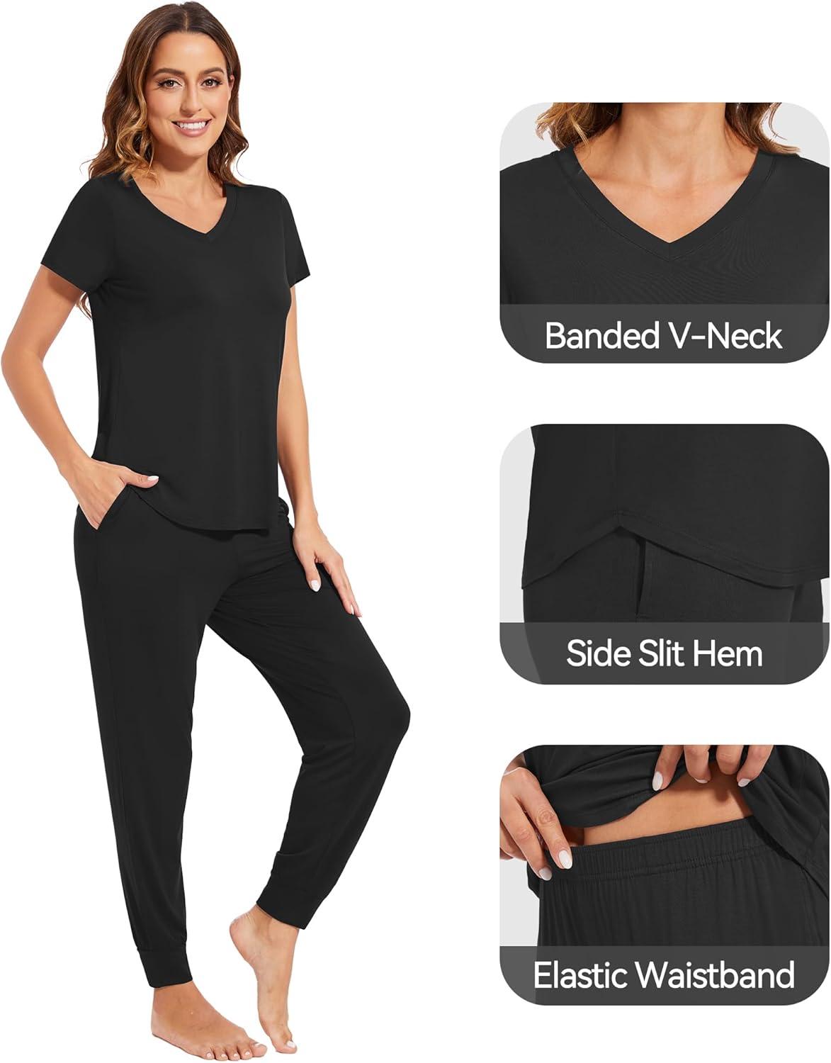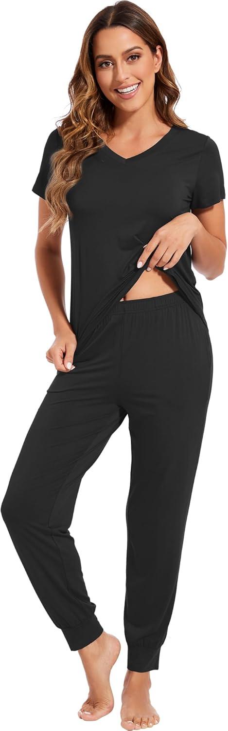 WiWi Pajamas for Women Soft Pajama Sets Short Sleeve Tops with Jogger Pants Viscose from Bamboo Pjs S-XXL(A-black)