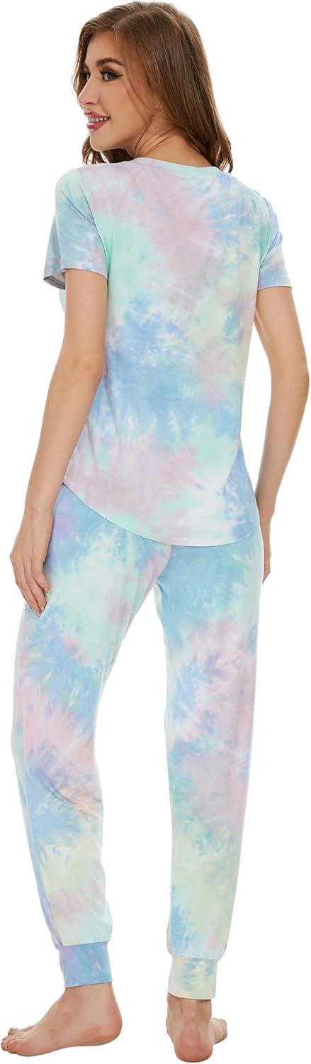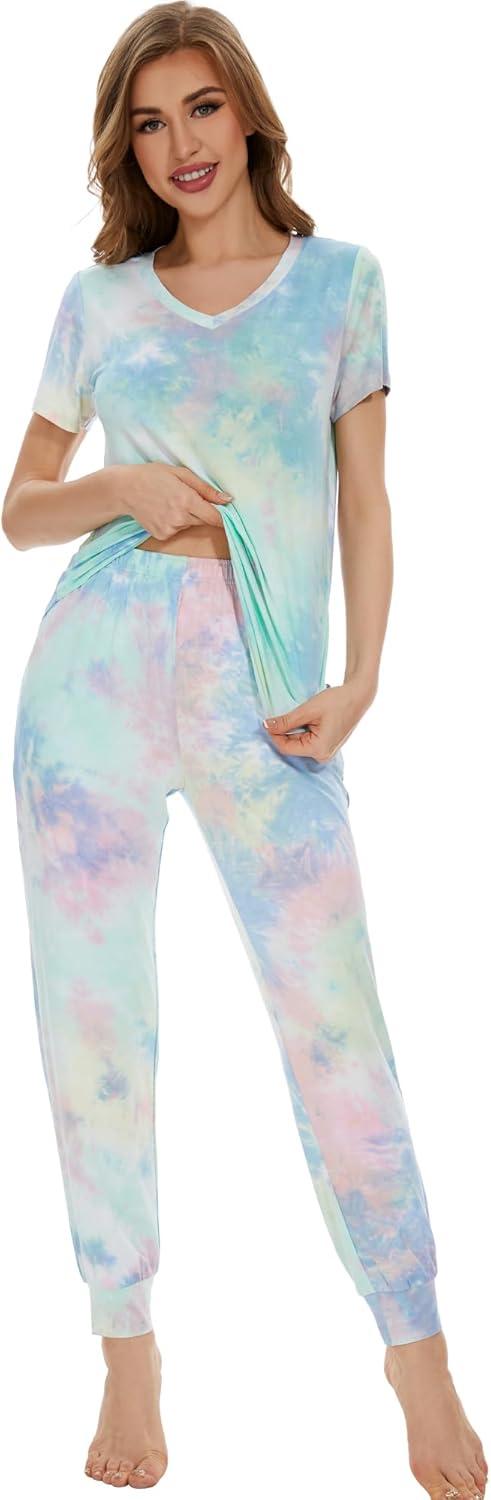 WiWi Pajamas for Women Soft Pajama Sets Short Sleeve Tops with Jogger Pants Viscose from Bamboo Pjs S-XXL(A-tie Dye)