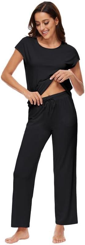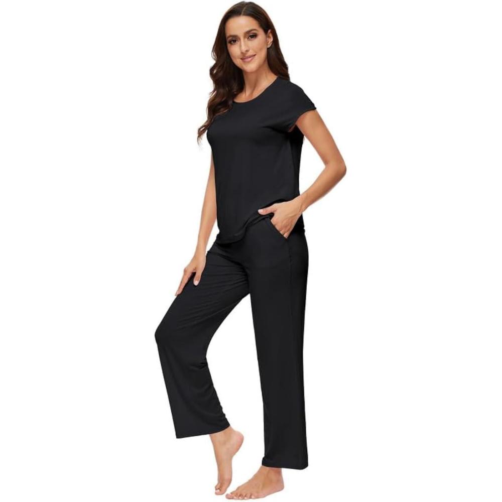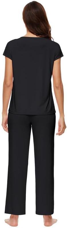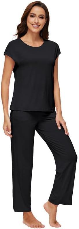 WiWi Soft Pajama Set for Women Short Sleeve Viscose from Bamboo Sleepwear Lightweight Loose Pajamas Pjs Sets S-XXL(A-black)