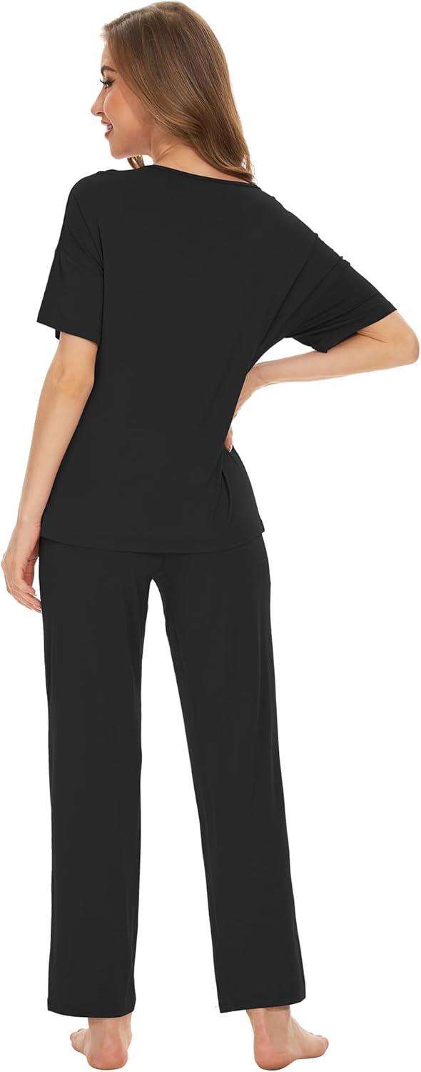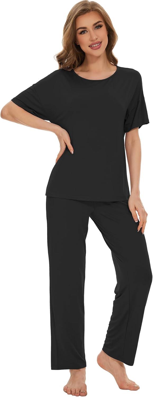 WiWi Soft Pajama Set for Women Short Sleeve Viscose from Bamboo Sleepwear Lightweight Loose Pajamas Pjs Sets S-XXL(B-black)