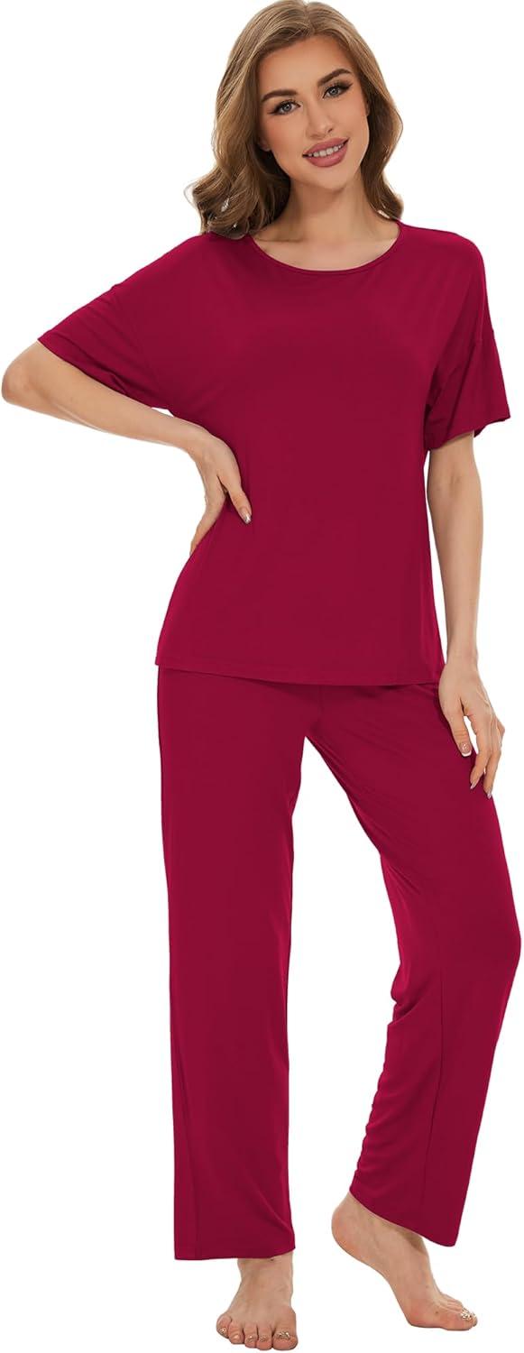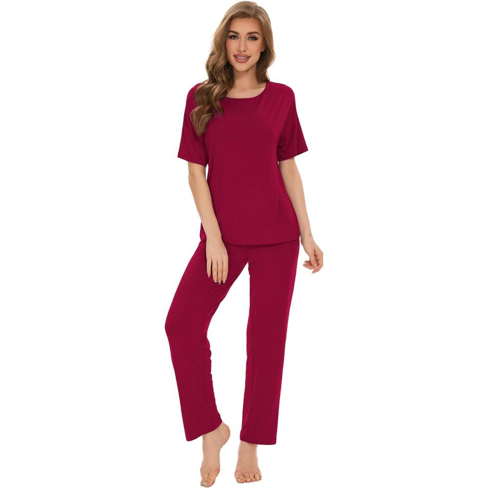 WiWi Soft Pajama Set for Women Short Sleeve Viscose from Bamboo Sleepwear Lightweight Loose Pajamas Pjs Sets S-XXL(B-wine Red)
