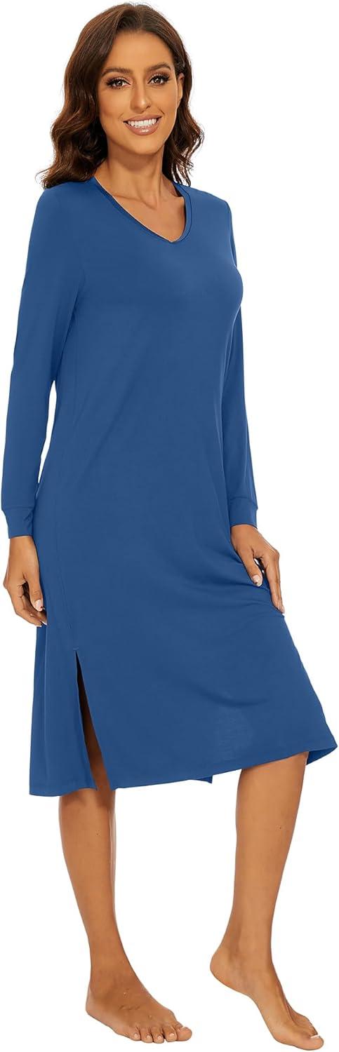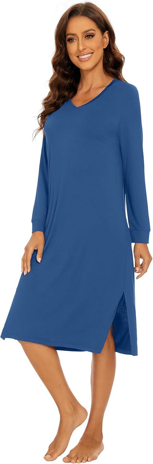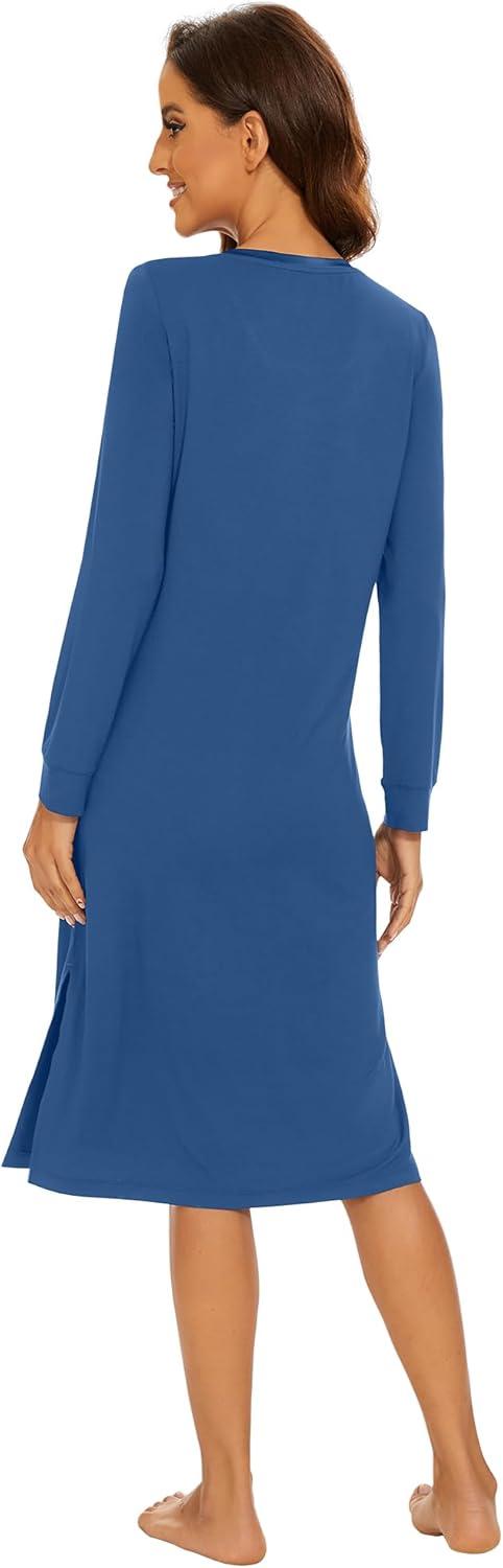 WiWi Viscose from Bamboo Nightgowns for Women Long Sleeve Nightgown Soft Pajamas Warm Pj Dress S-XXL(A-prussian Blue)