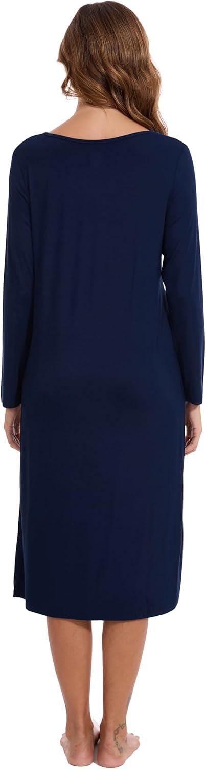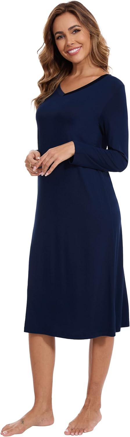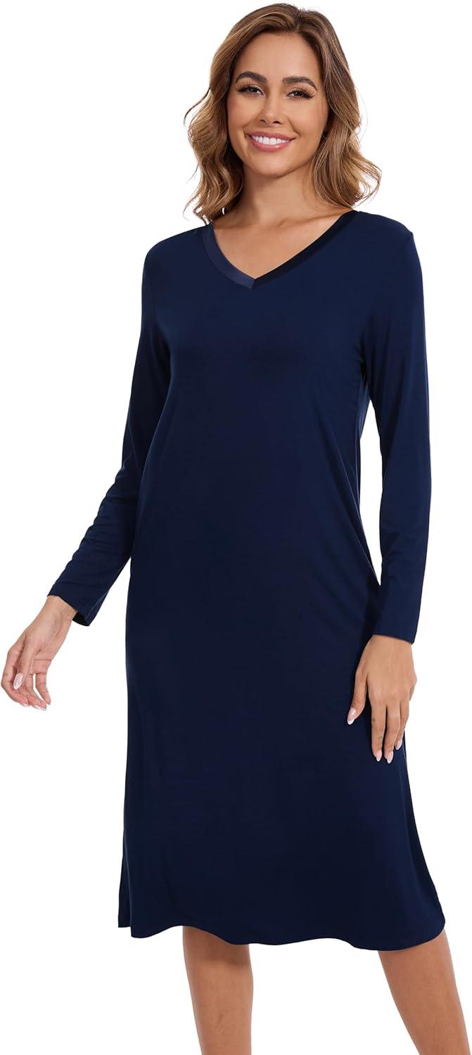 WiWi Viscose from Bamboo Nightgowns for Women Long Sleeve Nightgown Soft Pajamas Warm Pj Dress S-XXL(B-navy)