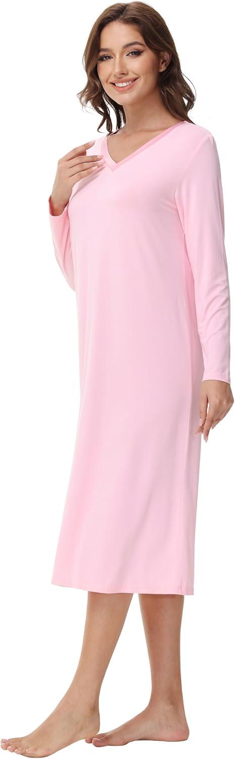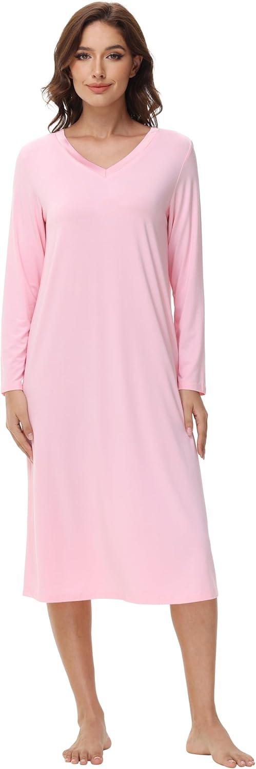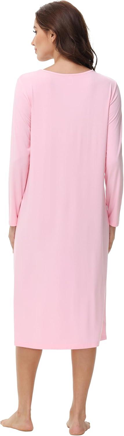 WiWi Viscose from Bamboo Nightgowns for Women Long Sleeve Nightgown Soft Pajamas Warm Pj Dress S-XXL(B-pink)