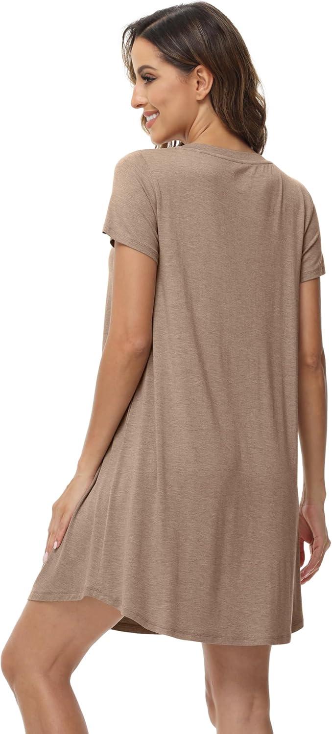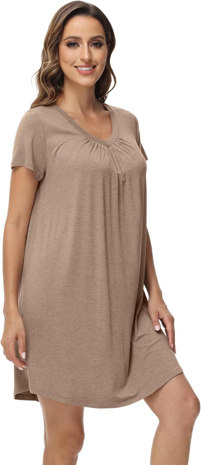 WiWi Viscose from Bamboo Nightgowns for Women Short Sleeve Pajama Dress V-neck Summer Night Shirts S-XXL(B-camel)
