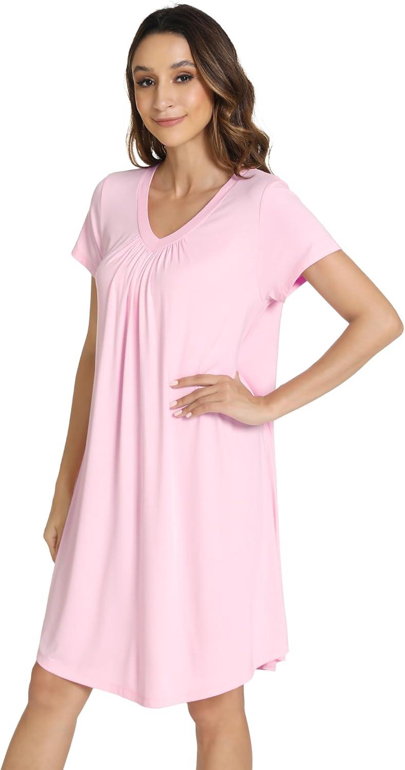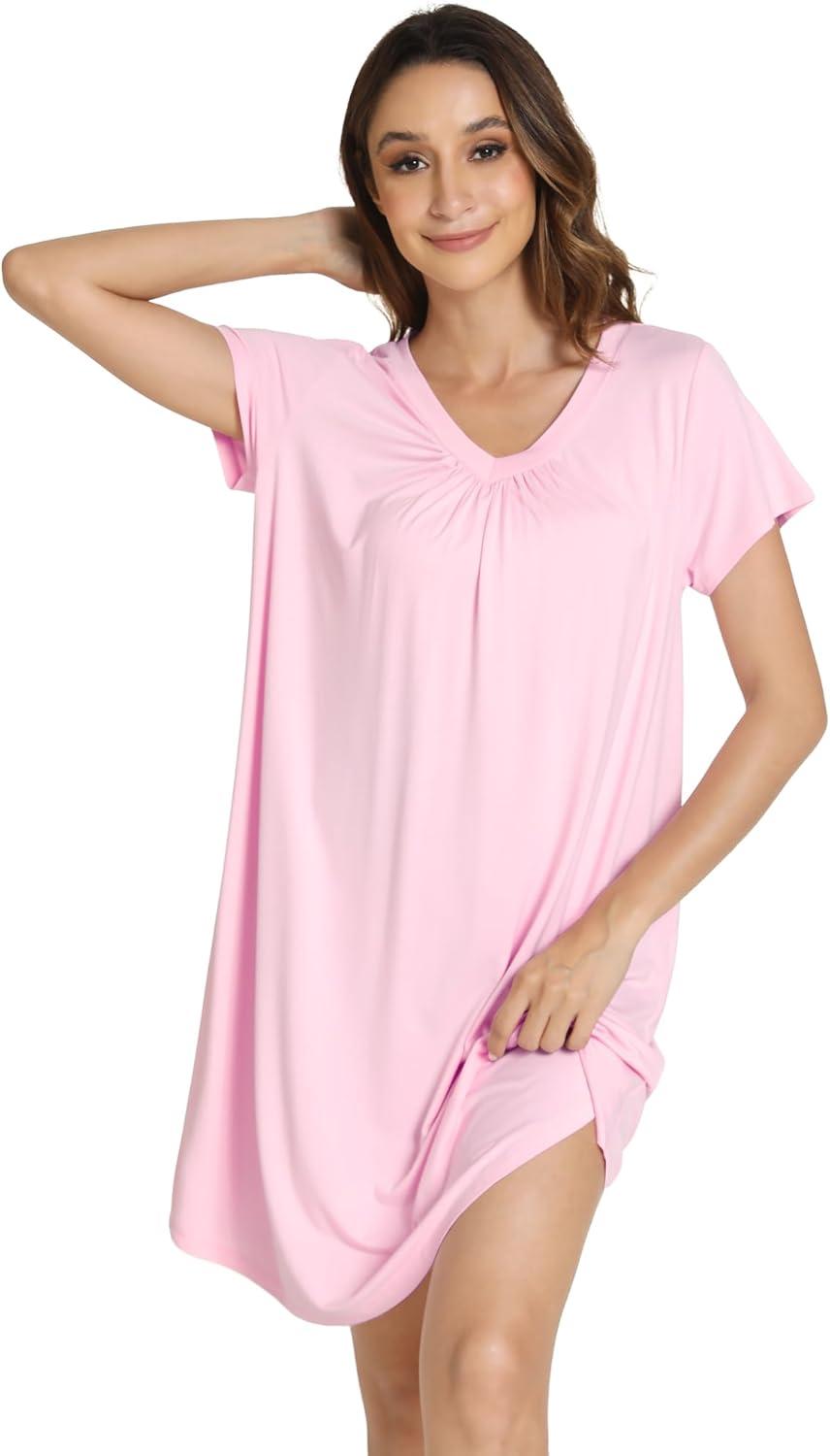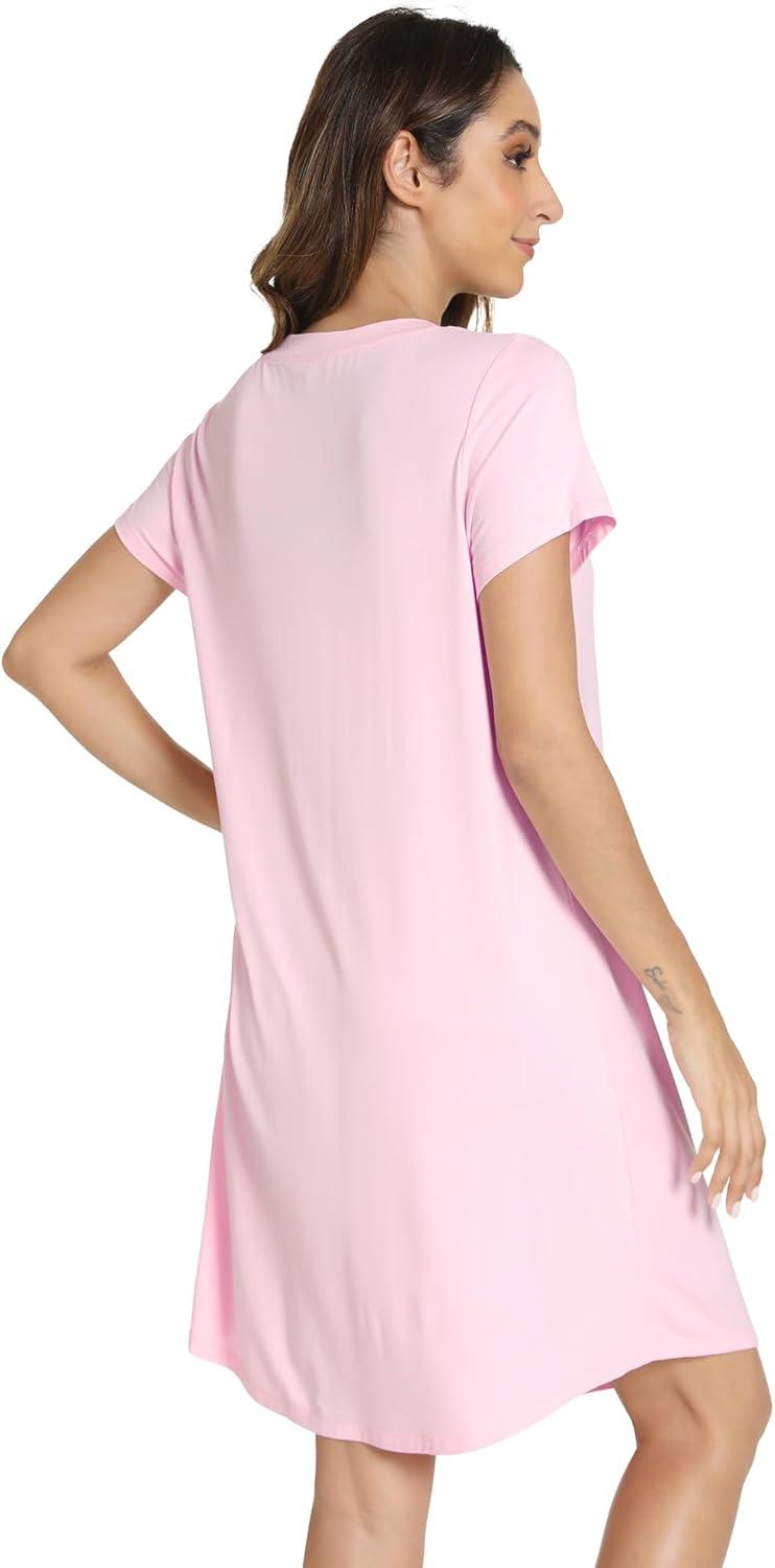 WiWi Viscose from Bamboo Nightgowns for Women Short Sleeve Pajama Dress V-neck Summer Night Shirts S-XXL(B-pink)