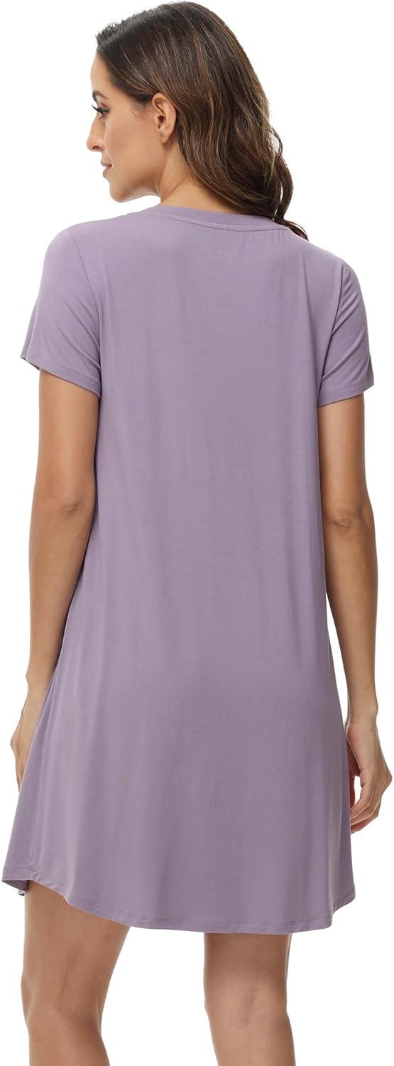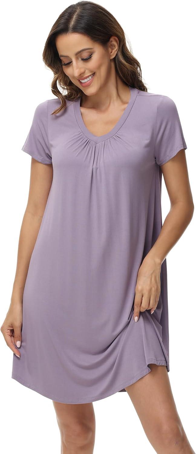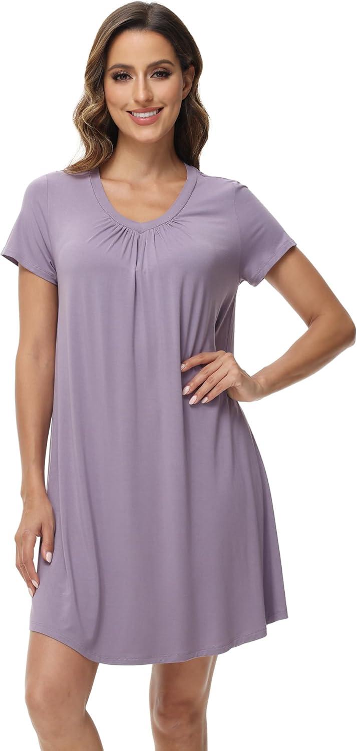 WiWi Viscose from Bamboo Nightgowns for Women Short Sleeve Pajama Dress V-neck Summer Night Shirts S-XXL(B-violet)