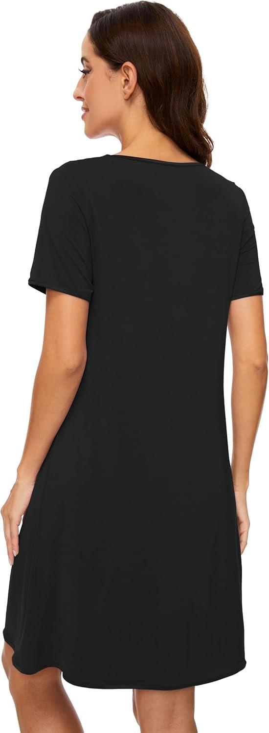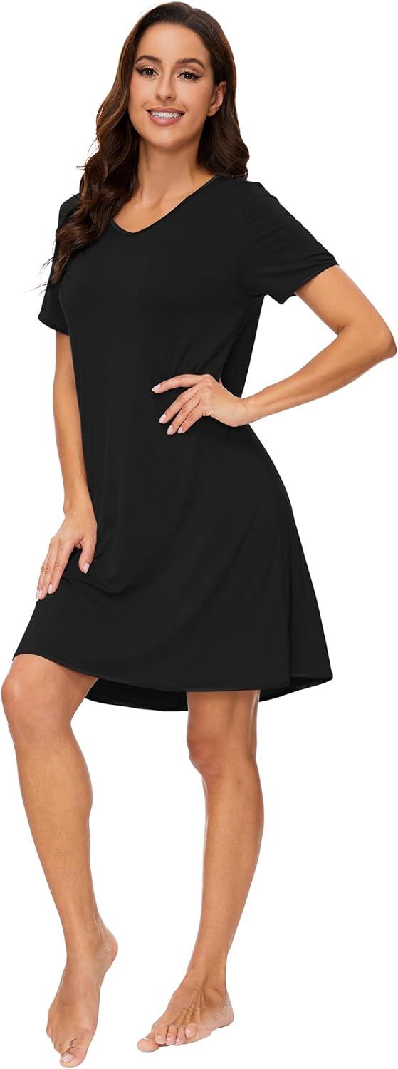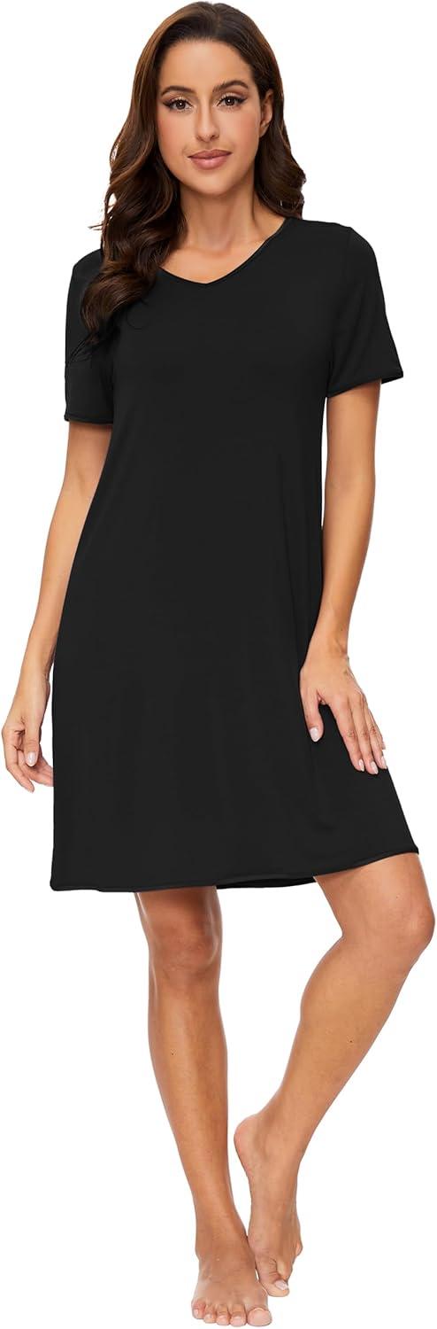 WiWi Viscose from Bamboo Nightgowns for Women Short Sleeve Pajama Dress V-neck Summer Night Shirts S-XXL(C-black)