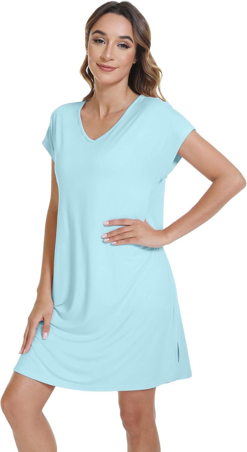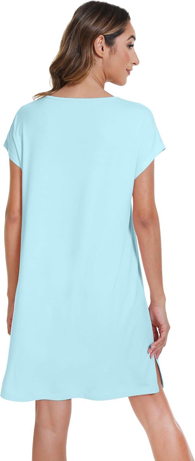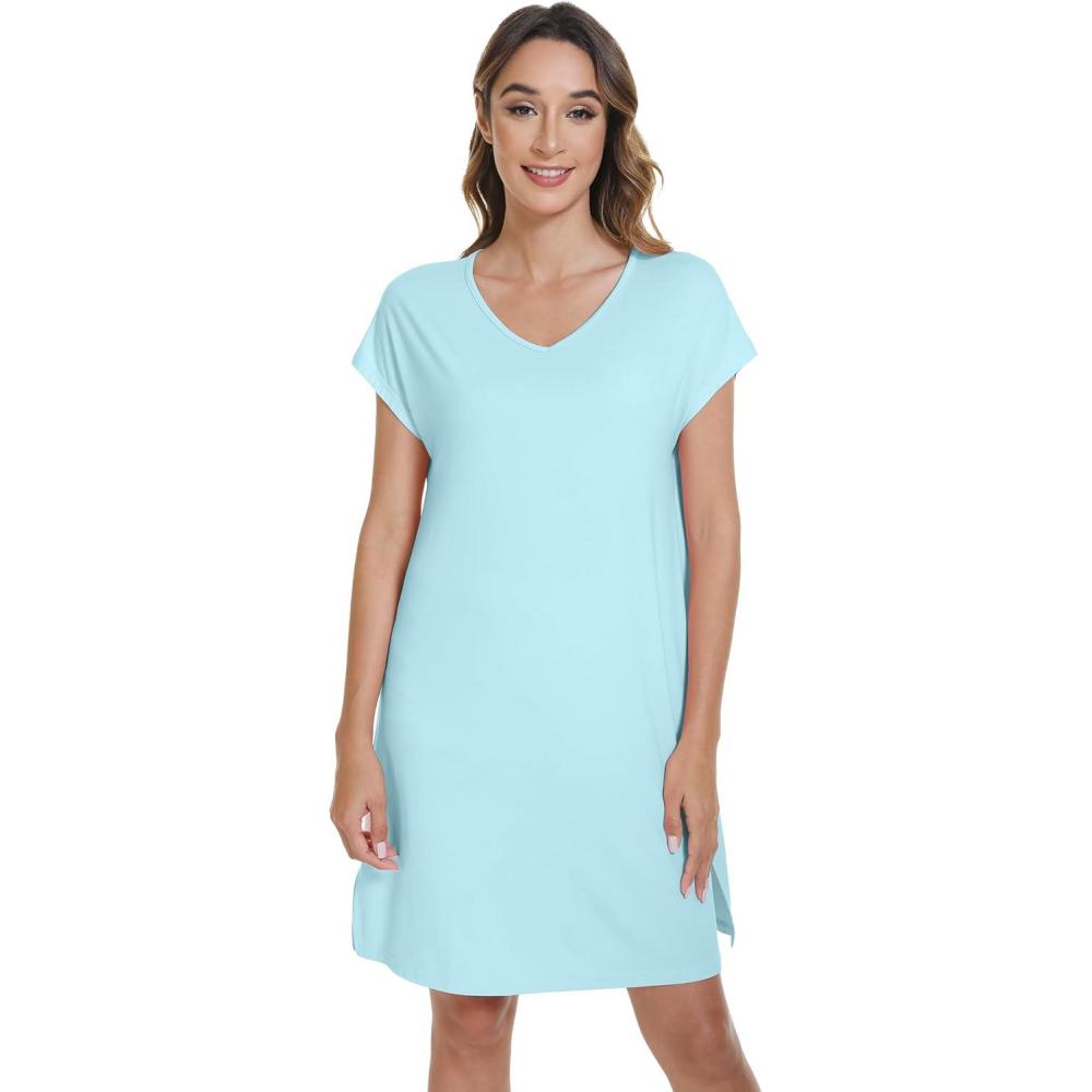 WiWi Viscose from Bamboo Nightgowns for Women Short Sleeve Pajama Dress V-neck Summer Night Shirts S-XXL(D-aqua)