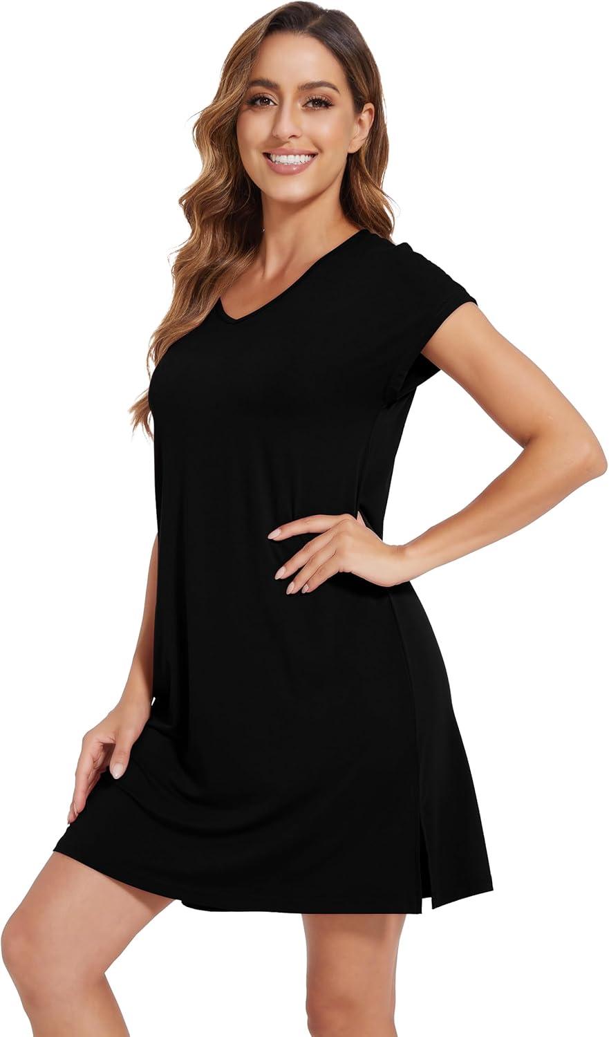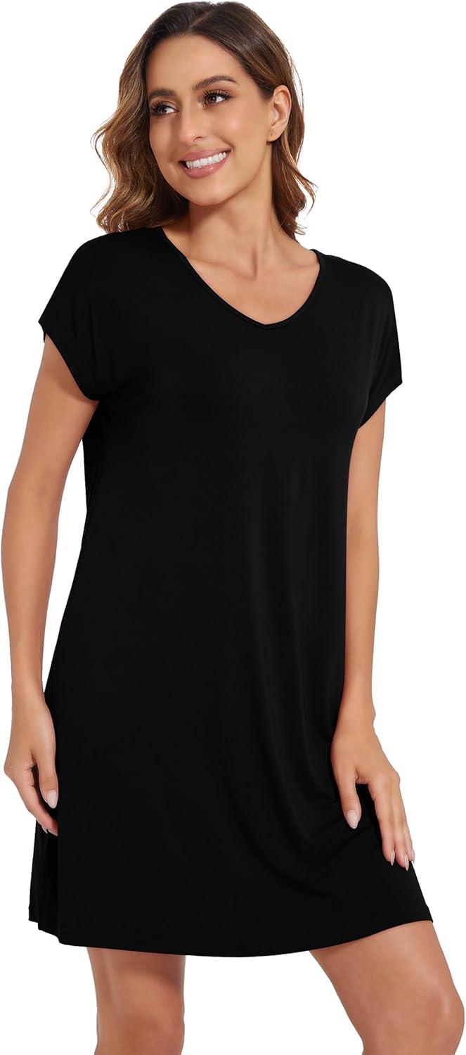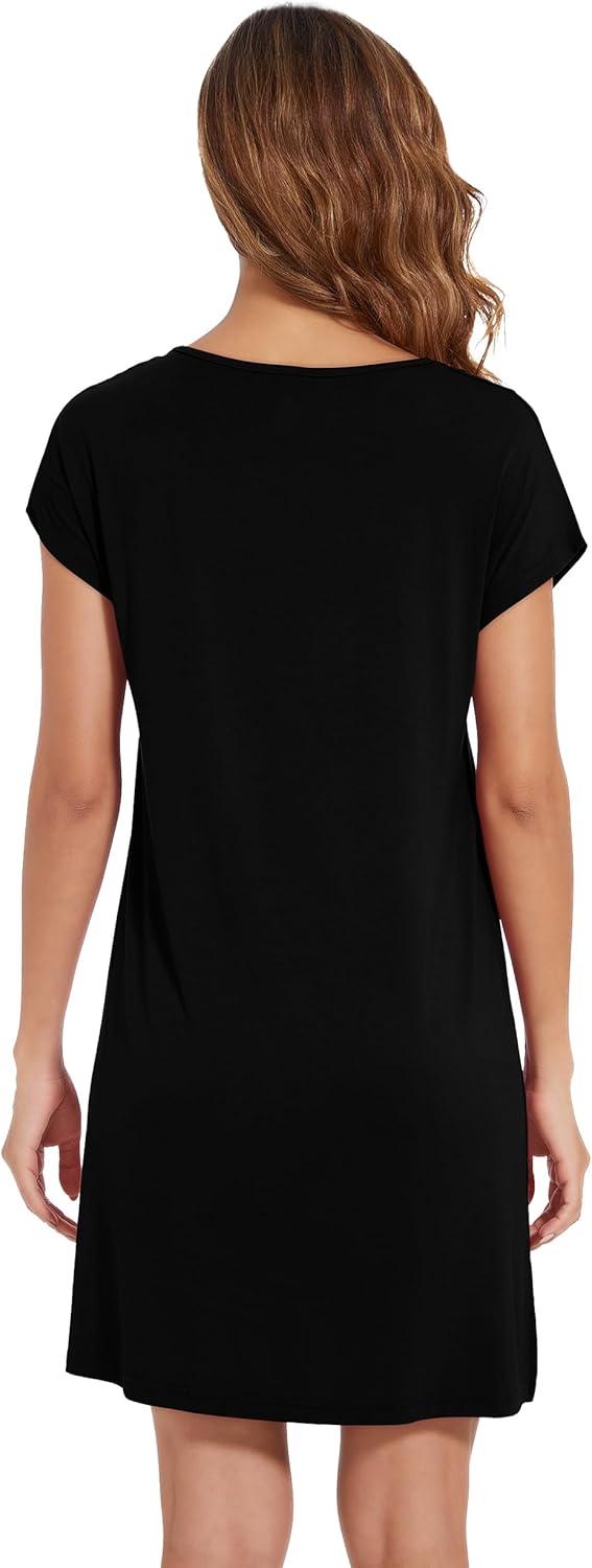 WiWi Viscose from Bamboo Nightgowns for Women Short Sleeve Pajama Dress V-neck Summer Night Shirts S-XXL(D-black)