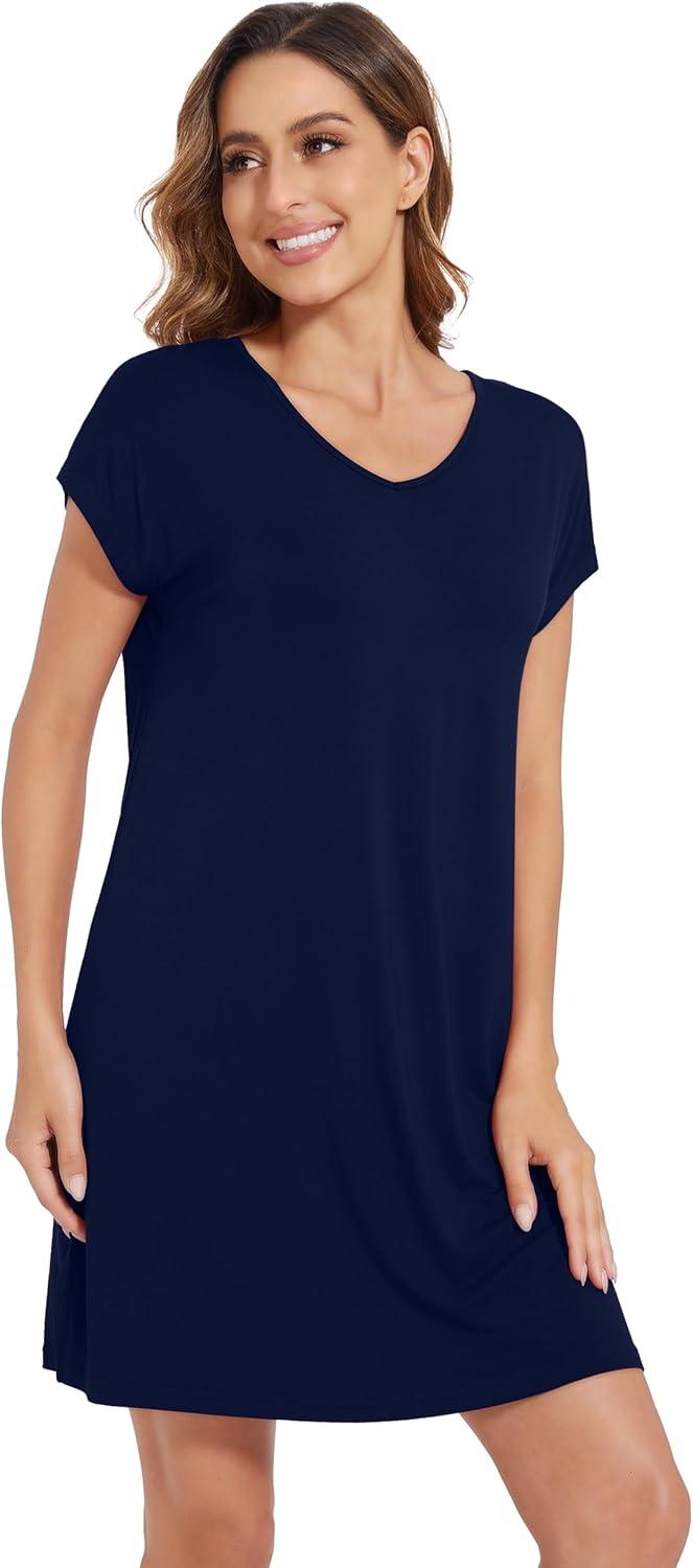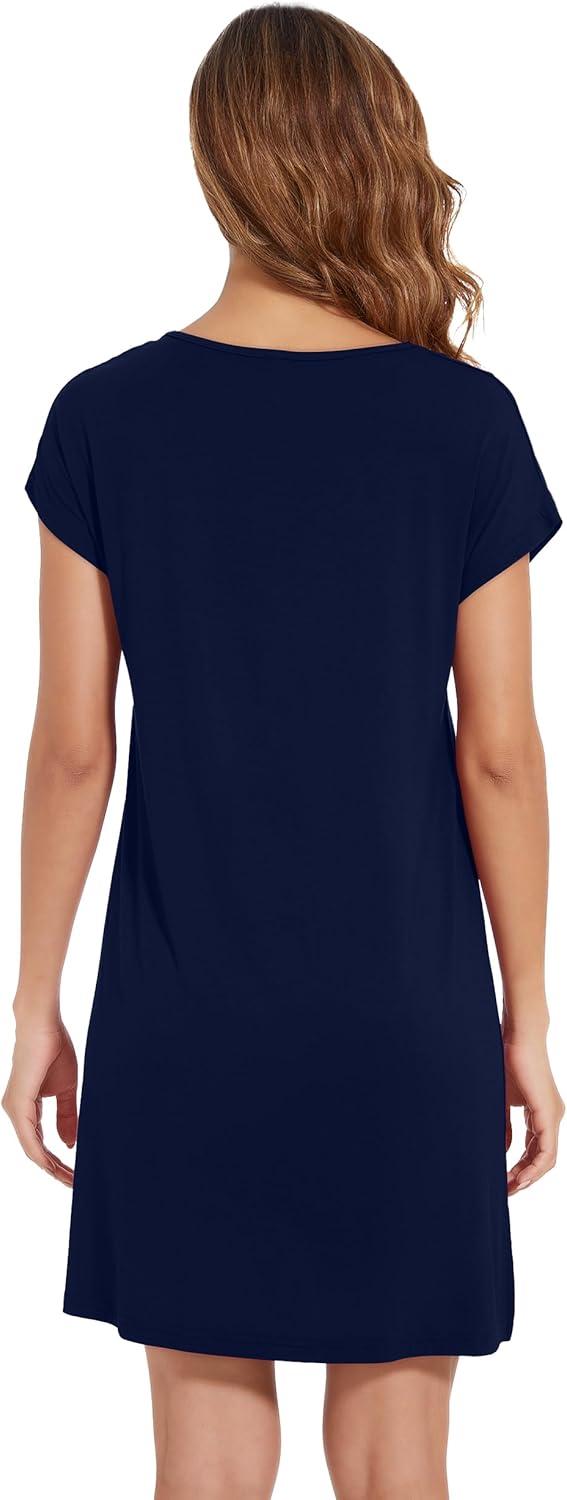 WiWi Viscose from Bamboo Nightgowns for Women Short Sleeve Pajama Dress V-neck Summer Night Shirts S-XXL(D-navy)