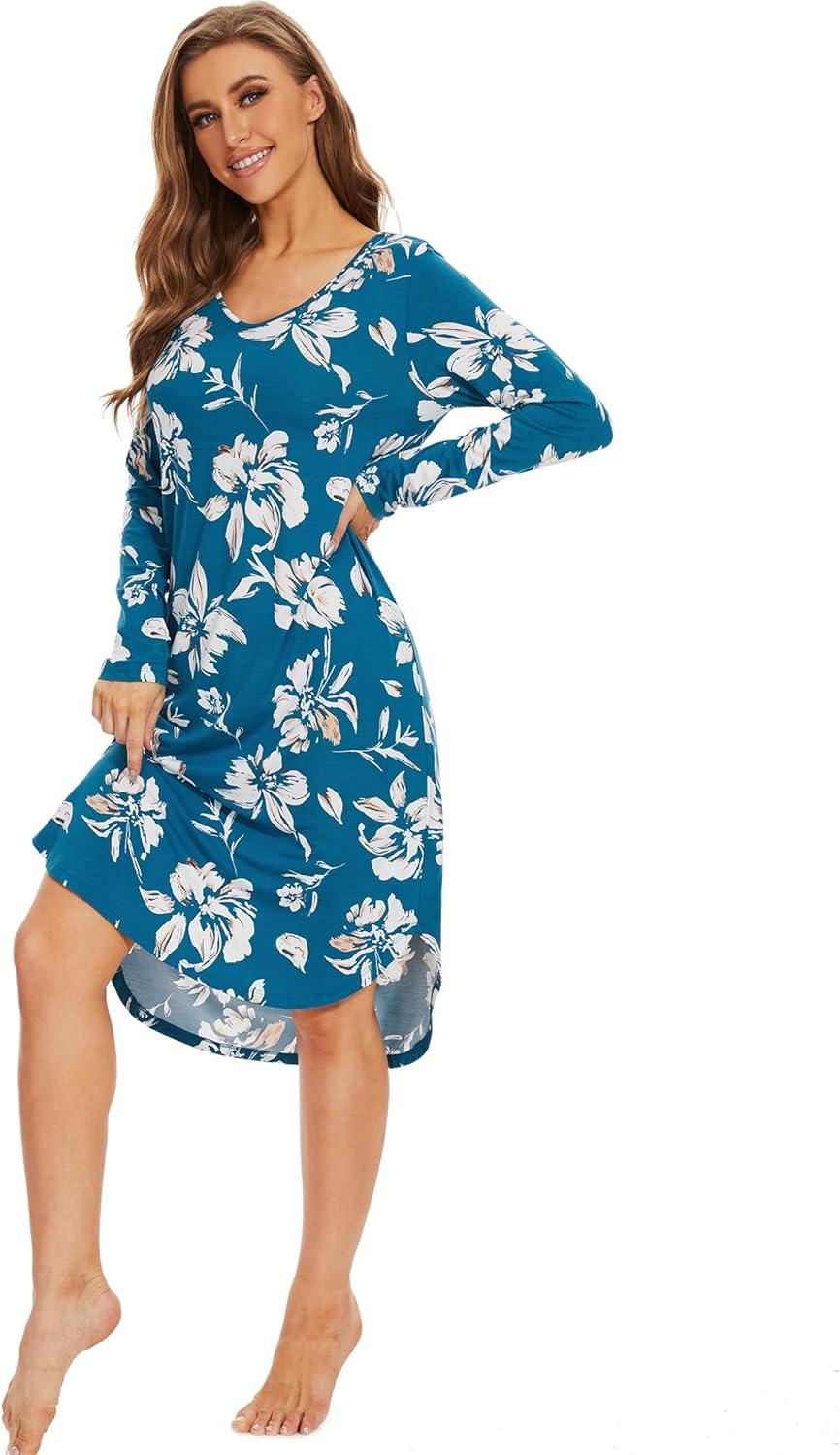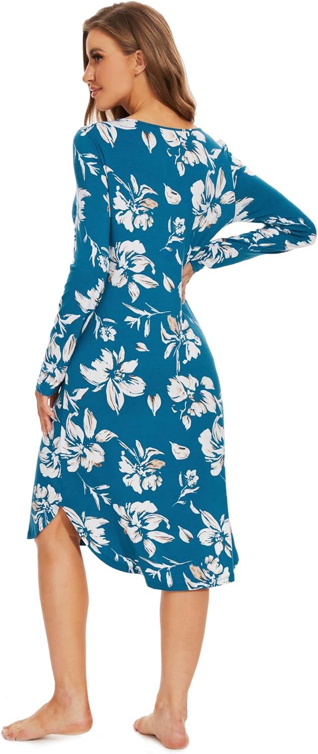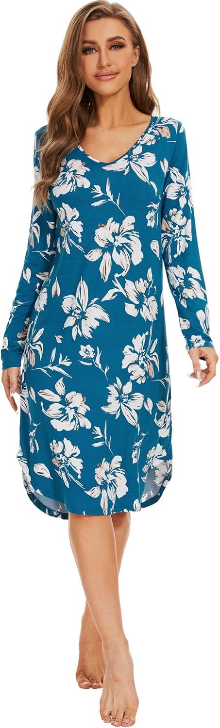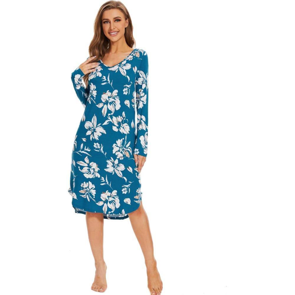 WiWi Viscose from Bamboo Nightgowns for Women Soft Long Sleeve Sleep Shirt S-4X(A-teal Blue Floral)