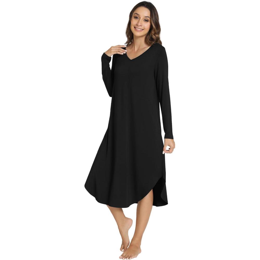 imageWiWi Viscose from Bamboo Nightgowns for Women Soft Long Sleeve Sleep Shirt S4XEblack