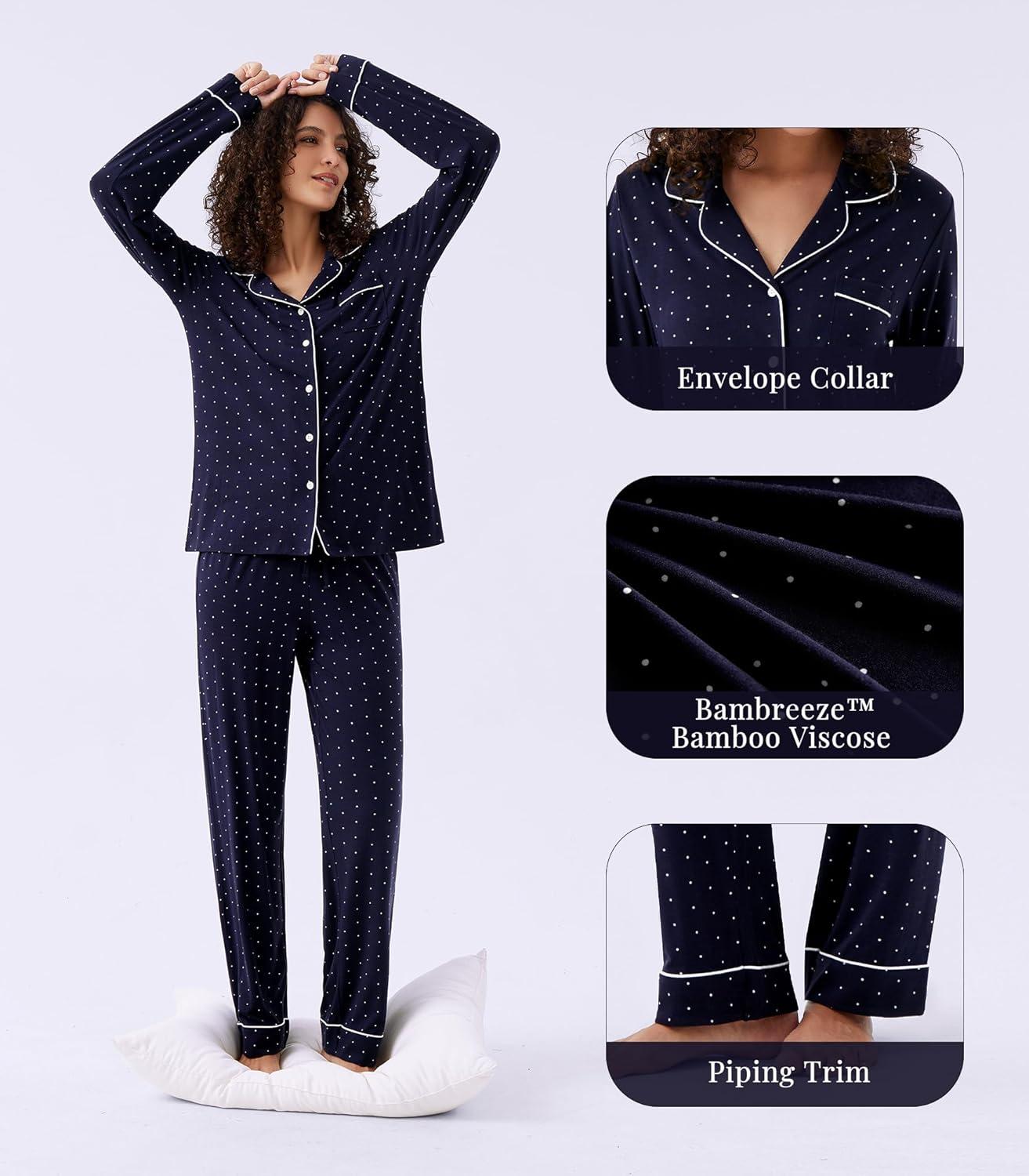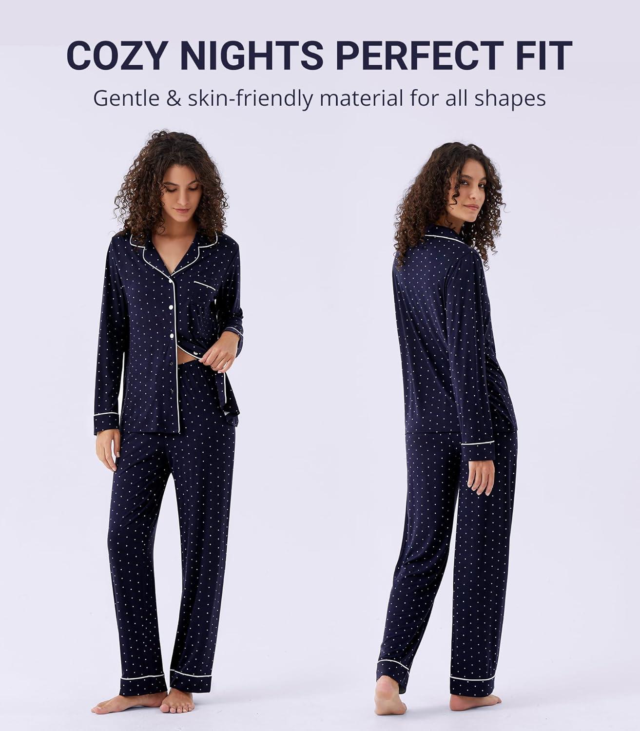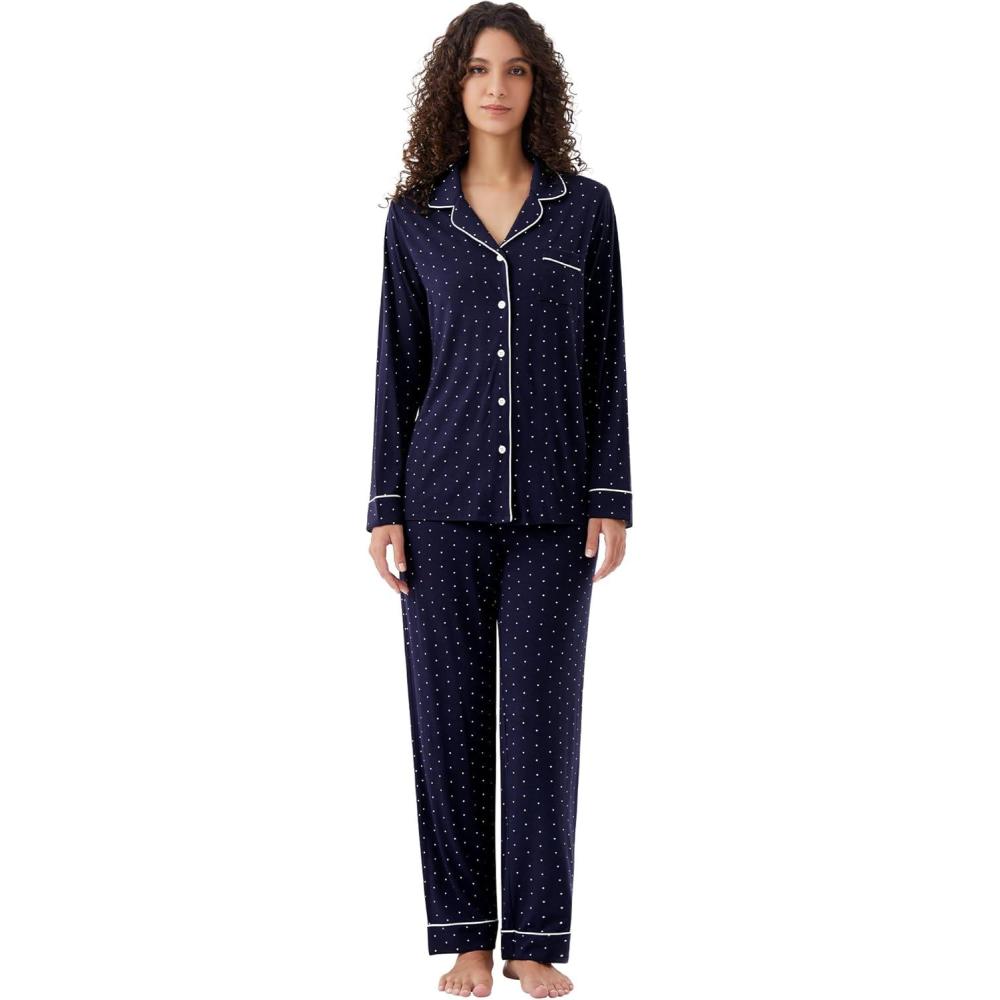 WiWi Viscose from Bamboo Pajamas Set for Women Soft Button Down Sleepwear Pj Lightweight Lounge Sets Loungewear S-XXL(A-navy/White Dots)