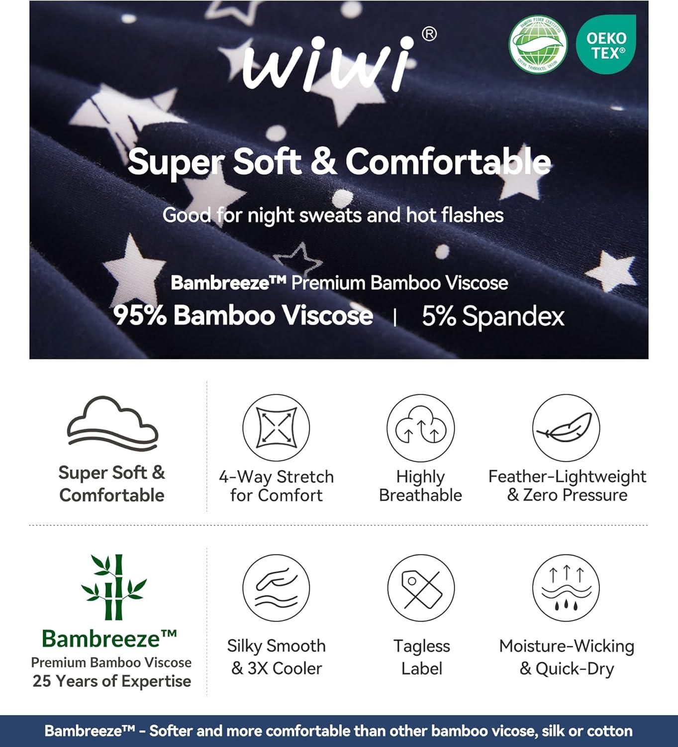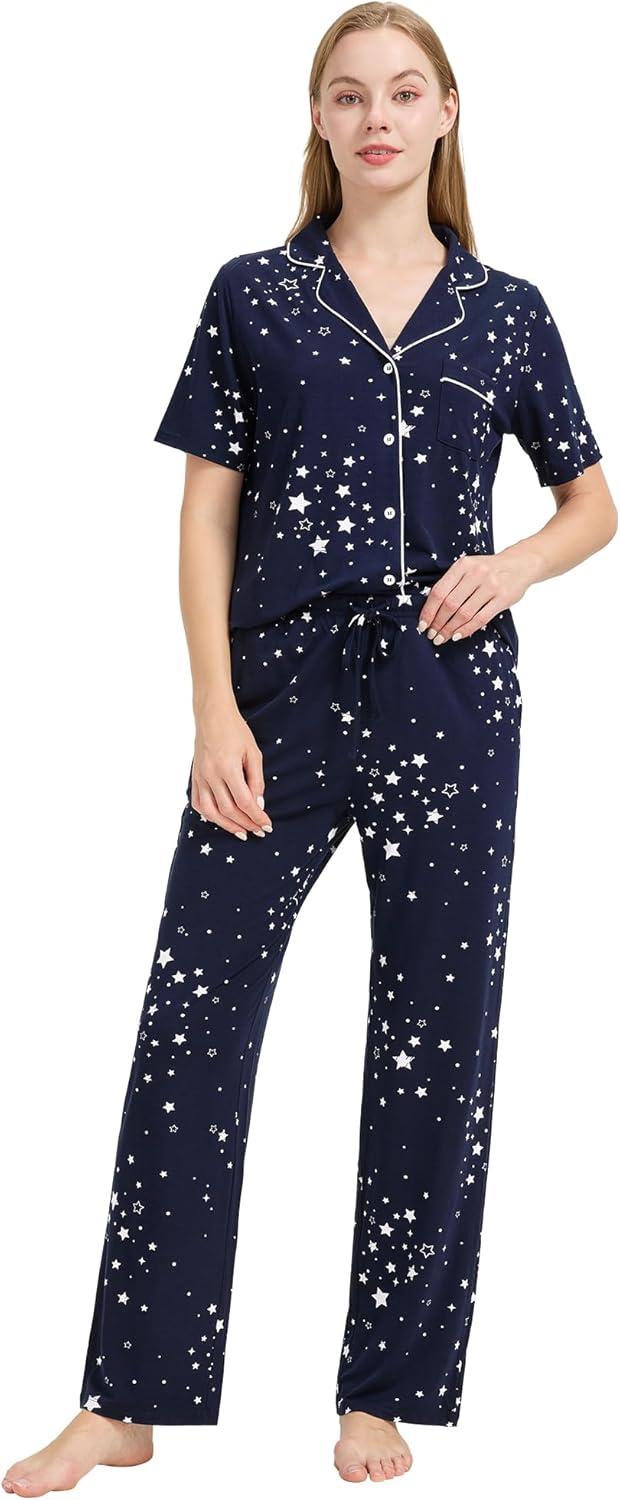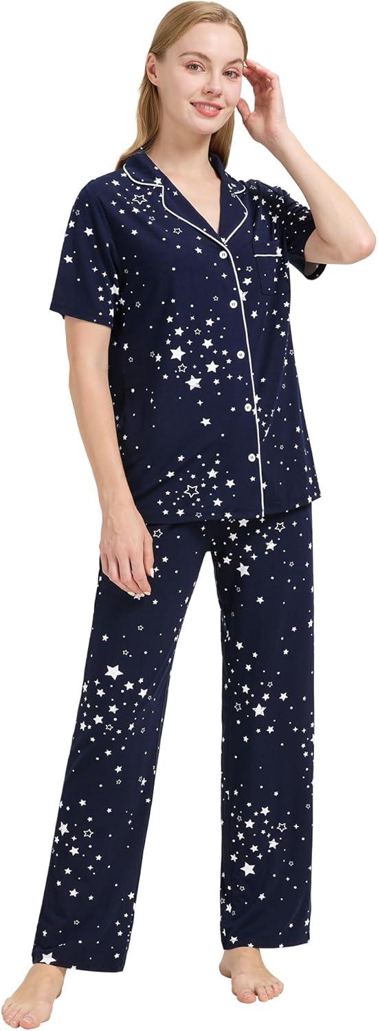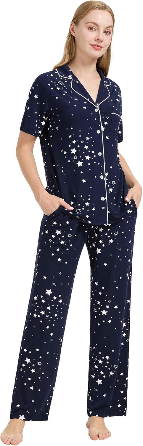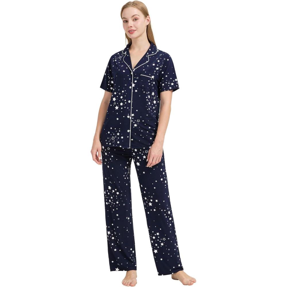 WiWi Viscose from Bamboo Pajamas Set for Women Soft Button Down Sleepwear Pj Lightweight Lounge Sets Loungewear S-XXL(B-navy Stars)