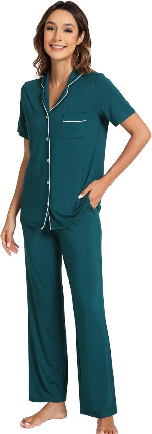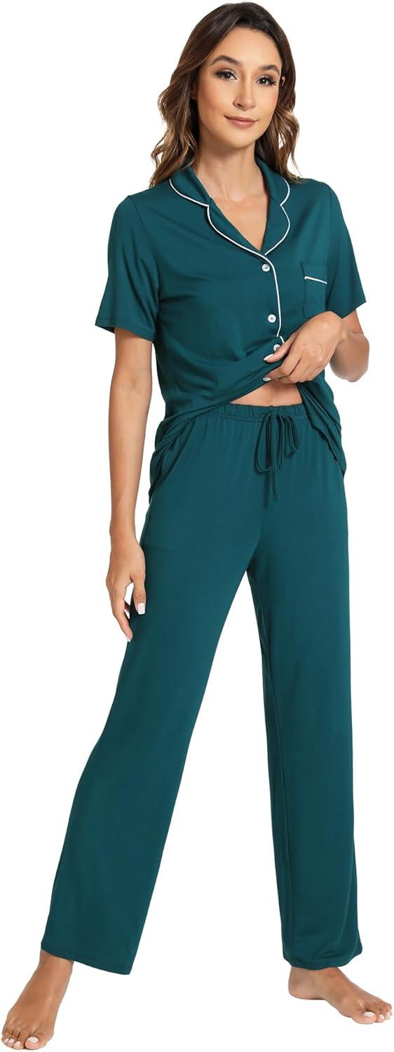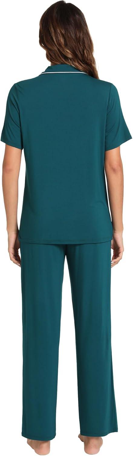 WiWi Viscose from Bamboo Pajamas Set for Women Soft Button Down Sleepwear Pj Lightweight Lounge Sets Loungewear S-XXL(B-peacock Green)