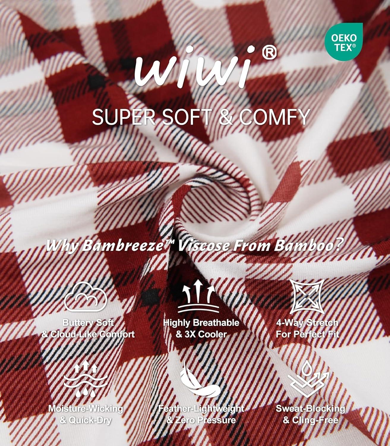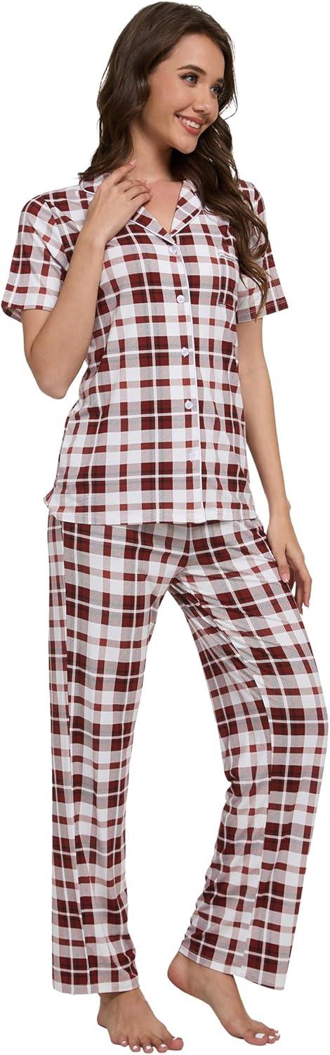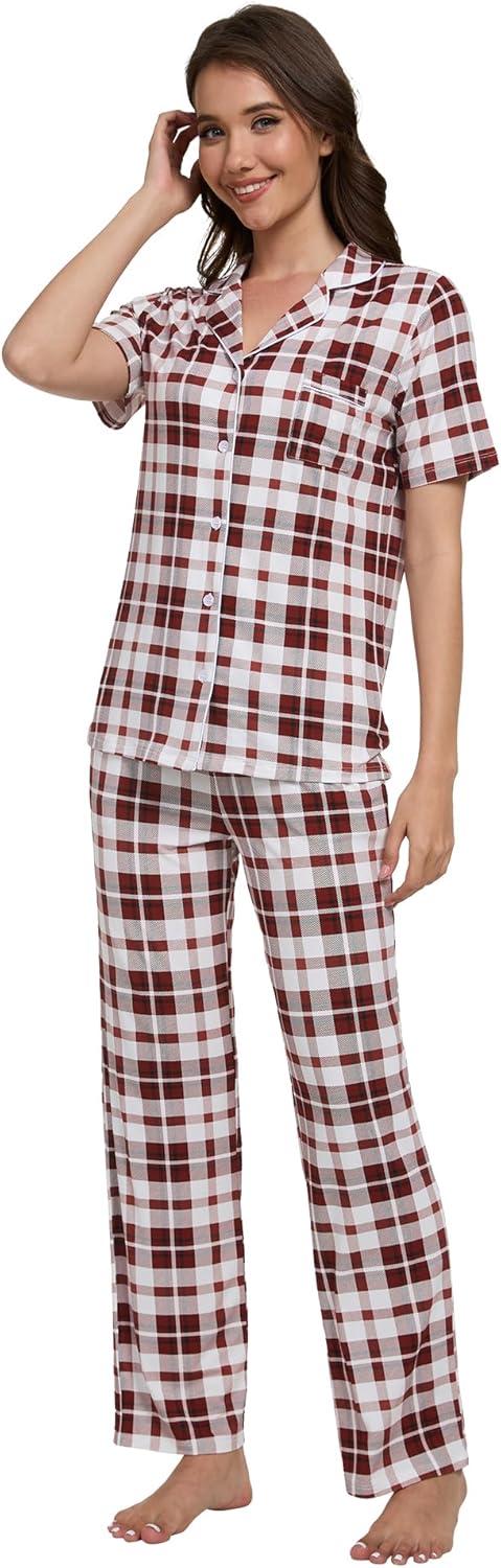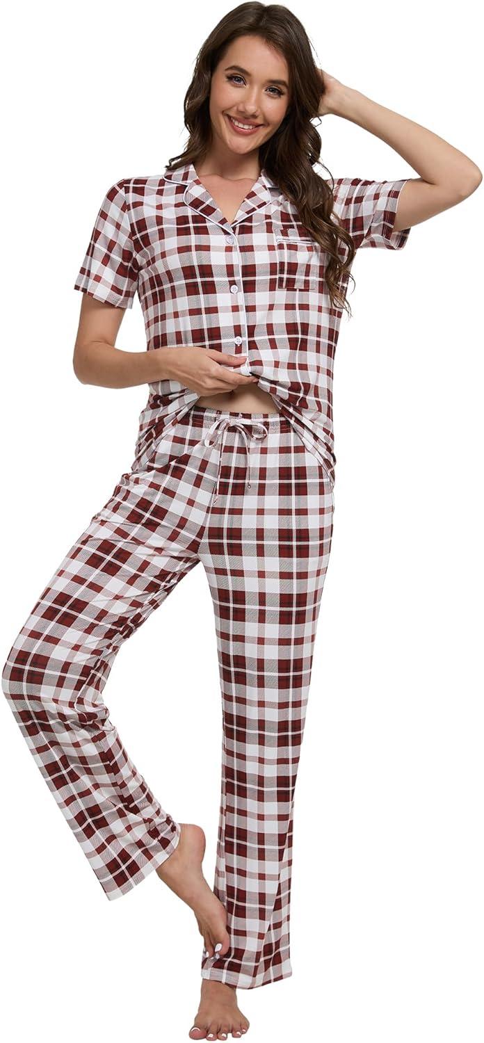 WiWi Viscose from Bamboo Pajamas Set for Women Soft Button Down Sleepwear Pj Lightweight Lounge Sets Loungewear S-XXL(B-red&white Plaid)