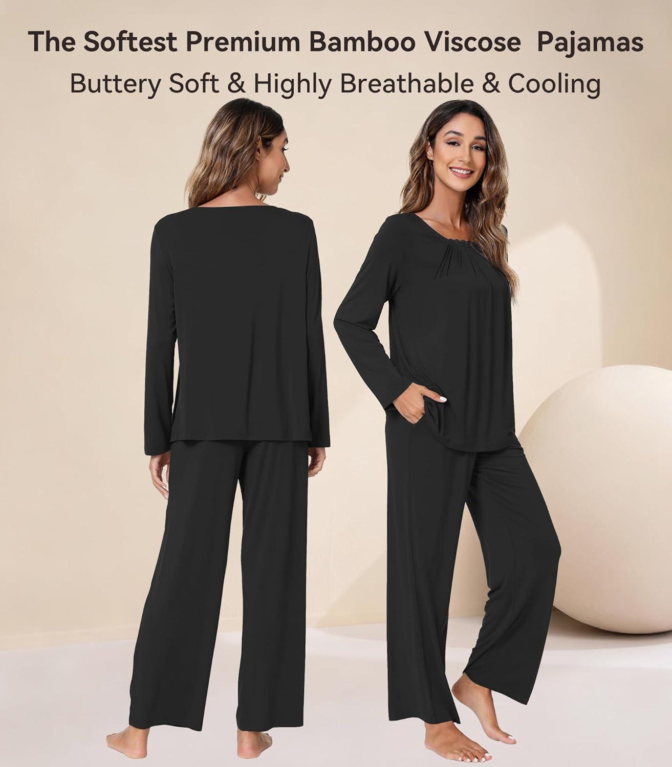 WiWi Viscose from Bamboo Pajamas Sets for Women Long Sleeve Sleepwear Soft V Neck Top with Pants Plus Size Pjs S-4X(B-black)
